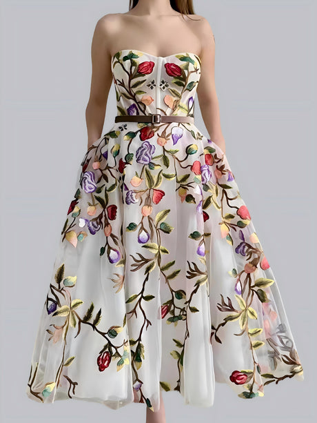 White 3D Flower Embroidery Mesh Off-shoulder Strapless Top Maxi Dresses