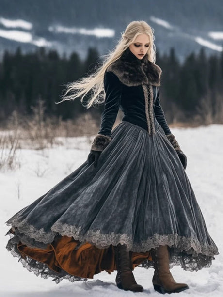 $56.86 USDUnit price /UnavailableVelvet Navy Western Prints Fur Collar Flannel Thickened Long Dress