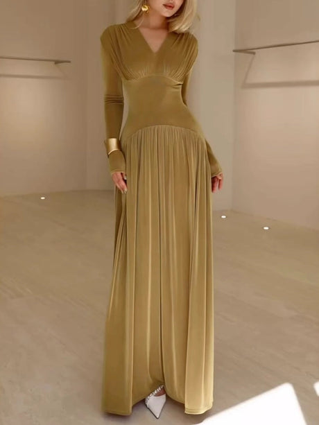 Long-sleeved Velvet With A Cowl Neckline Wrinkles Formal Dinner Cocktail Midi Dress