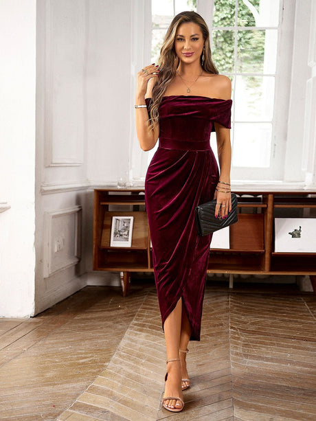 $25.00 USDUnit price /UnavailableLong-sleeved Square Neckline Burgundy Velvet Slit Formal Dinner Cocktail Party Christmas Midi Dress