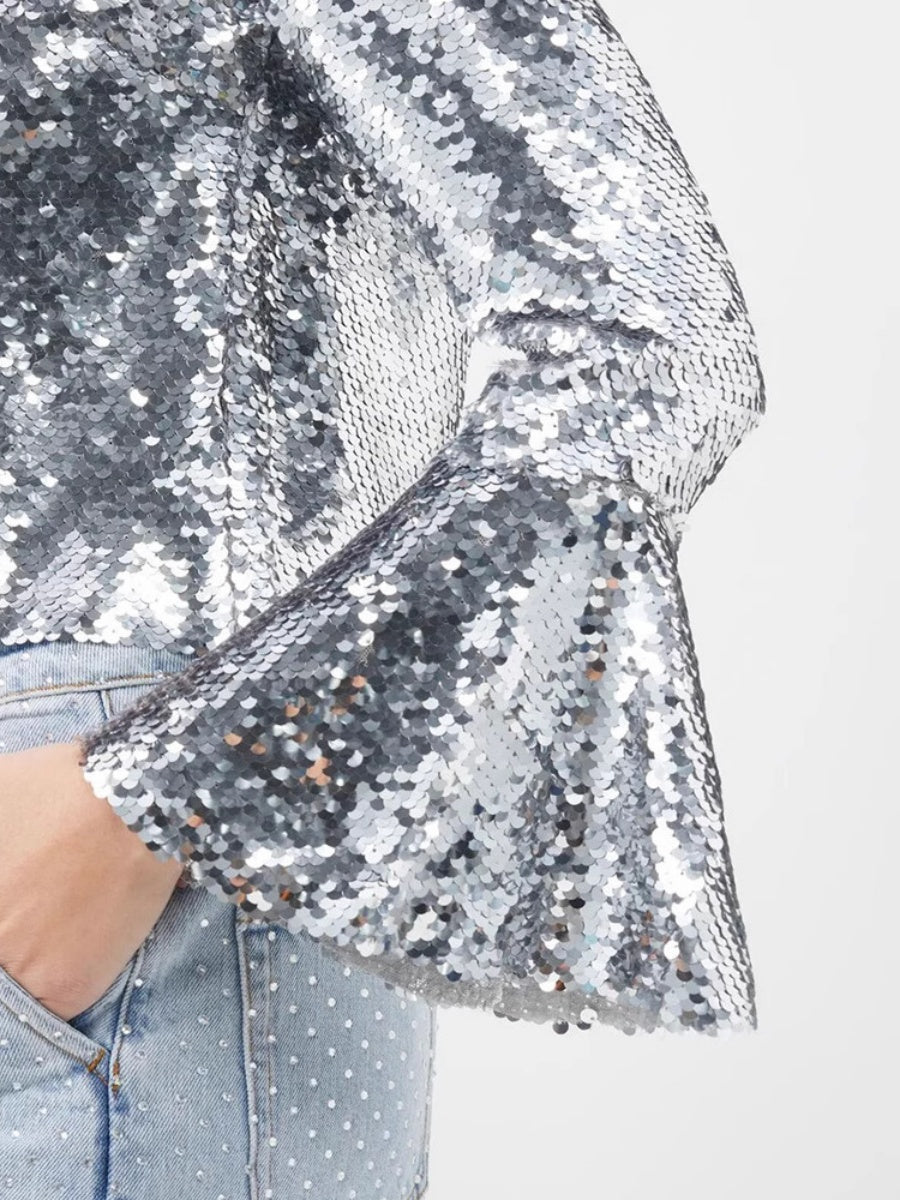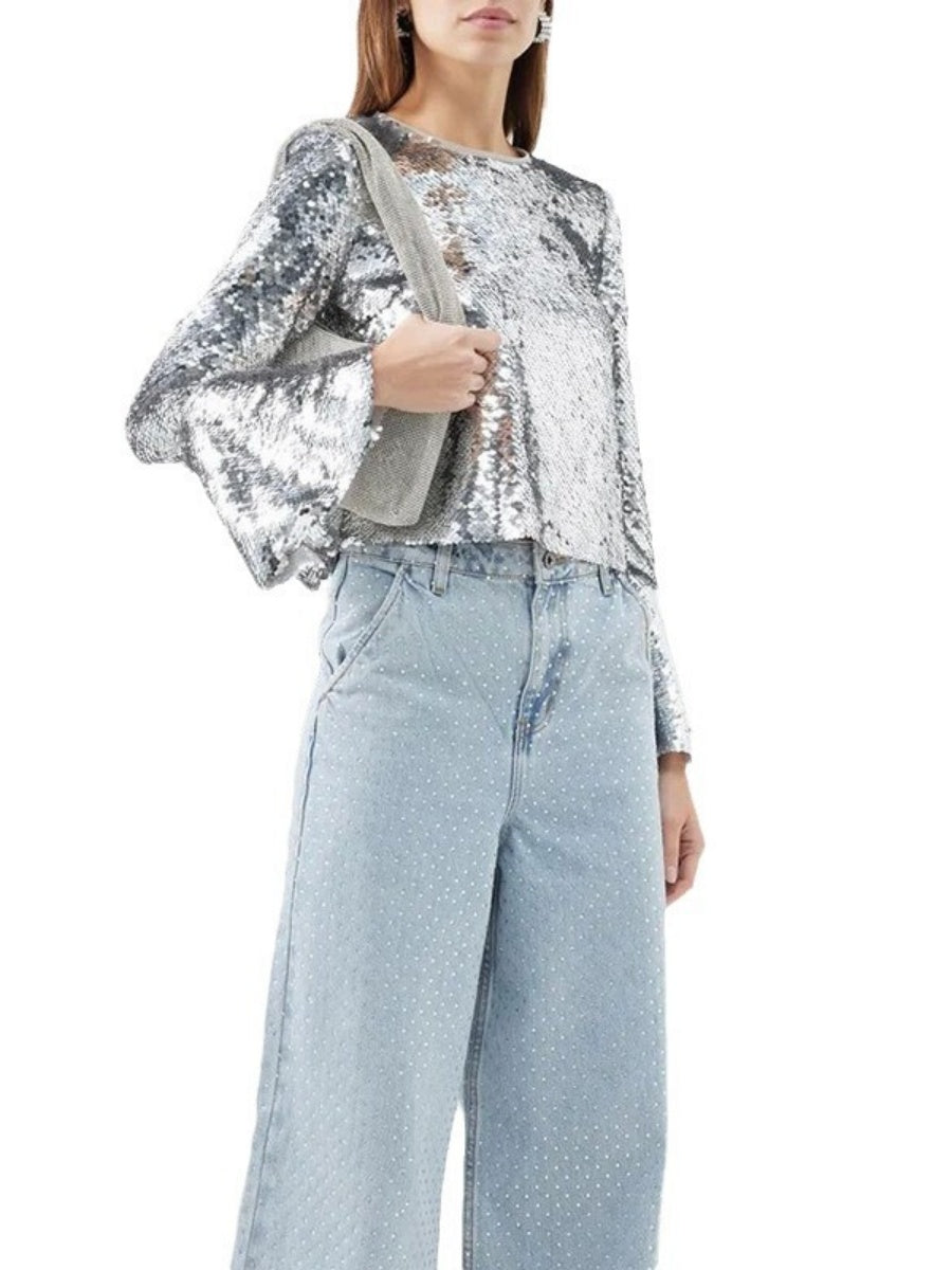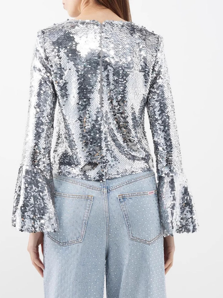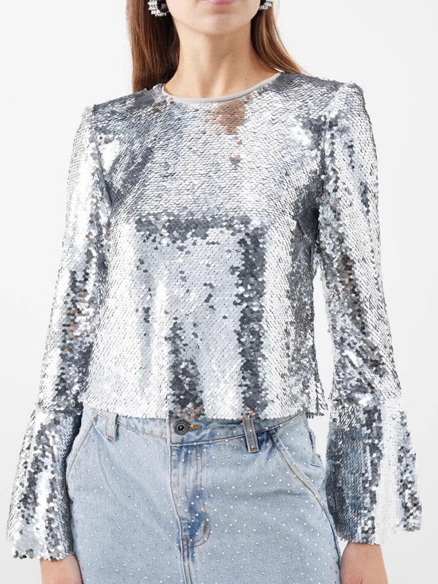 Silberne T-Shirts mit Rundhalsausschnitt, langen Ärmeln und kurzen ausgestellten Ärmeln