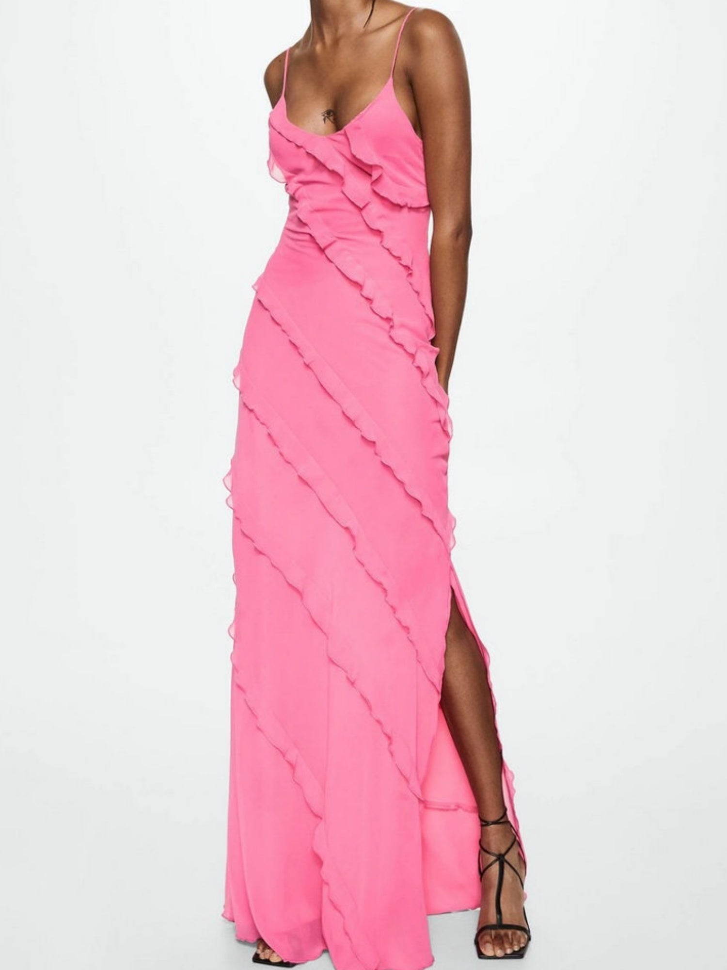 Ruffle Backless And Slit V-neck Suspenders Maxi Dresses
