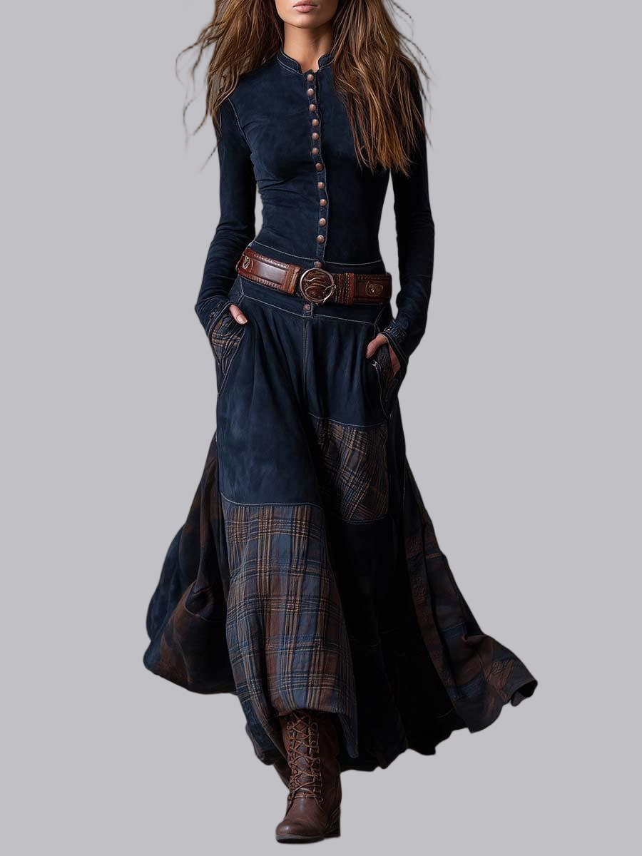 Maxikleider aus Wildleder mit Karomuster, Patchwork-Taschenknöpfen und Gürtel