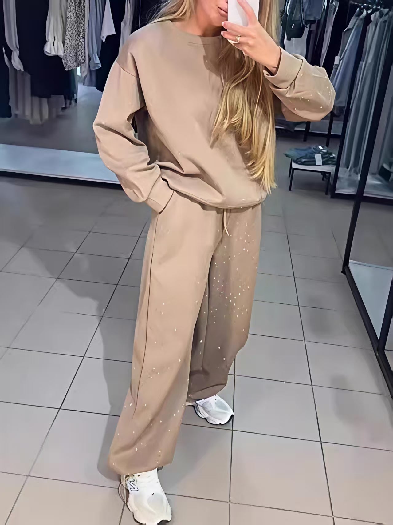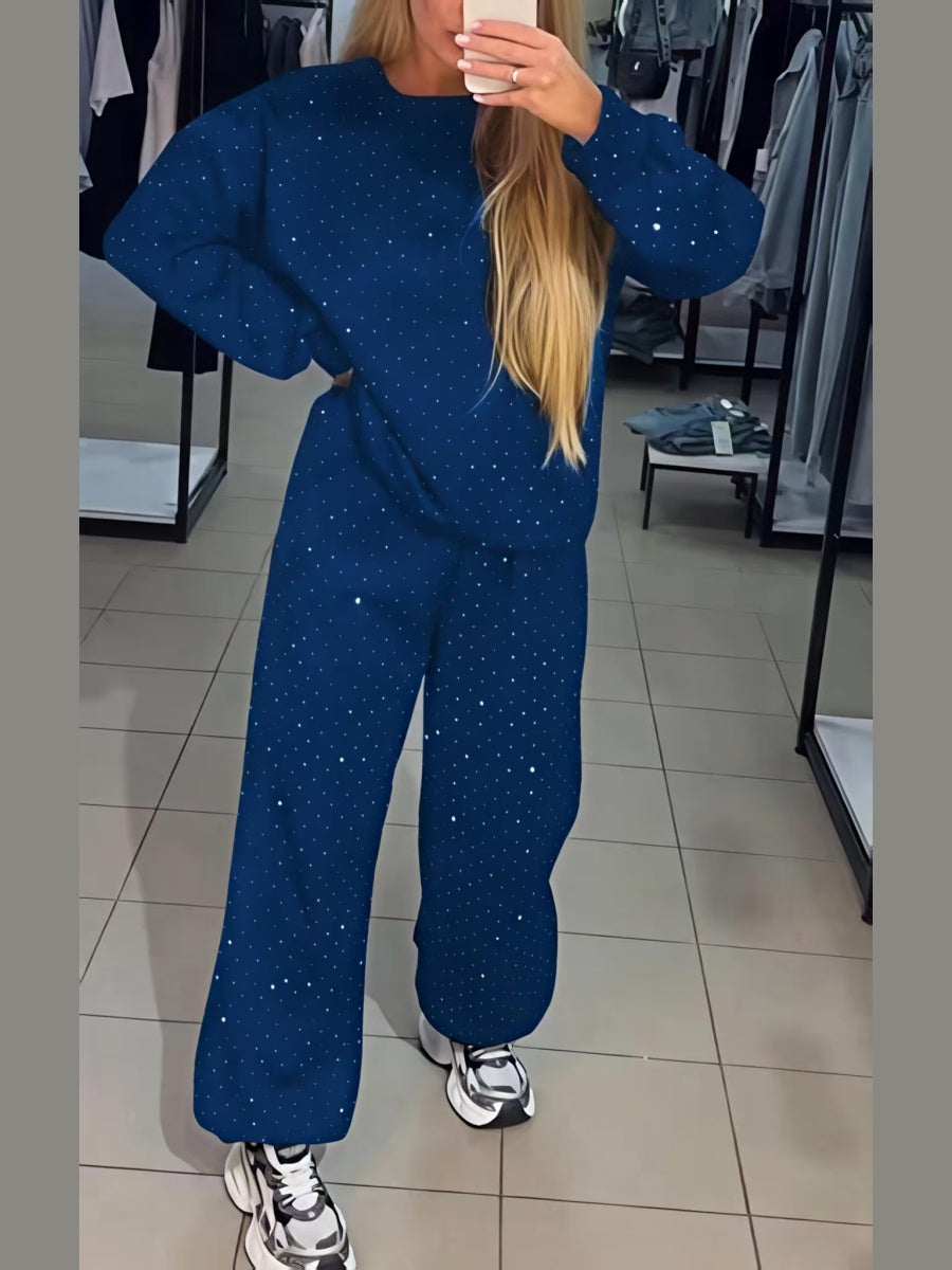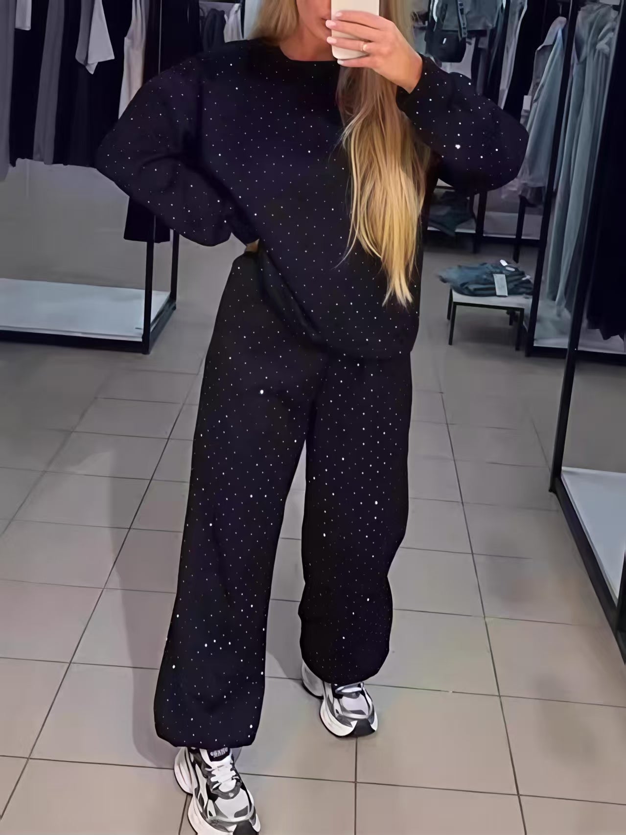 Zweiteiliges Set bestehend aus einem langärmeligen Top mit Rundhalsausschnitt, Strasssteinen und Kordelzug sowie einer Jogginghose.