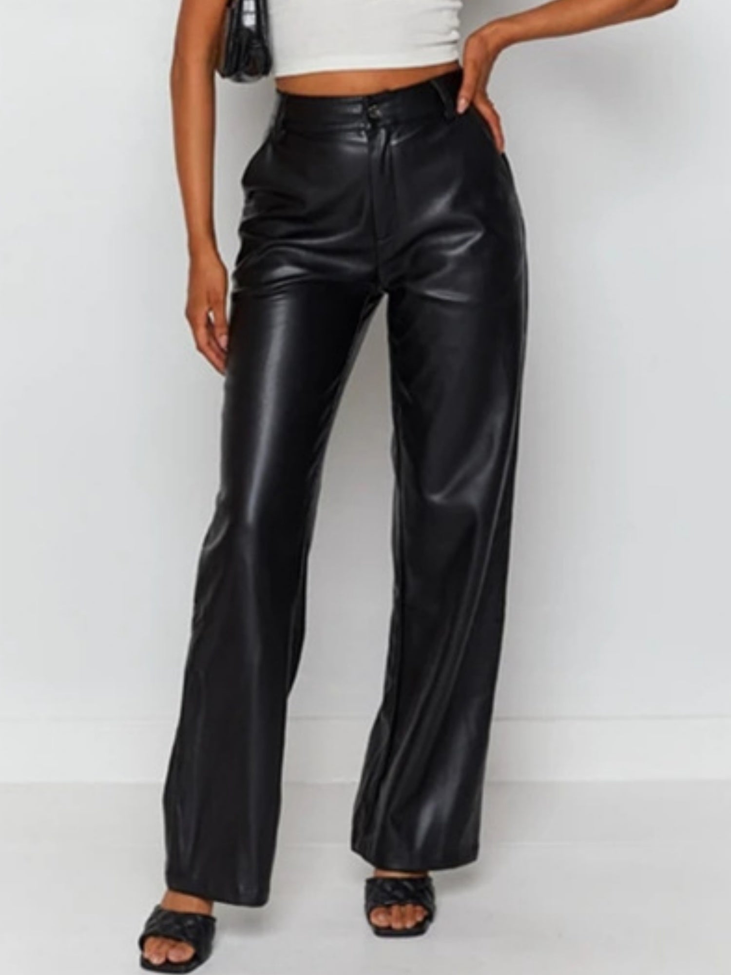 PU Leather Button Pocket High-waisted And High-elasticity Pants