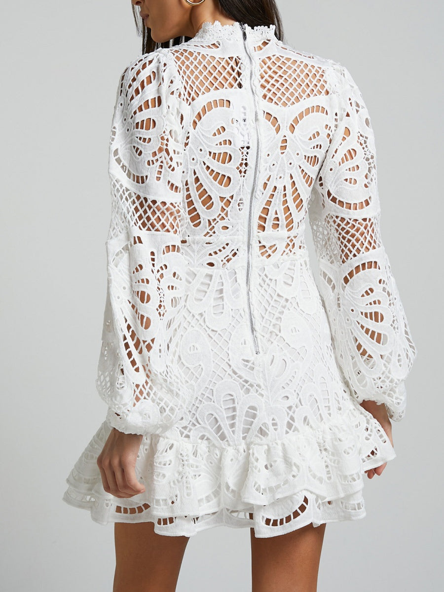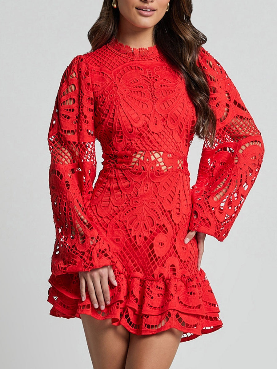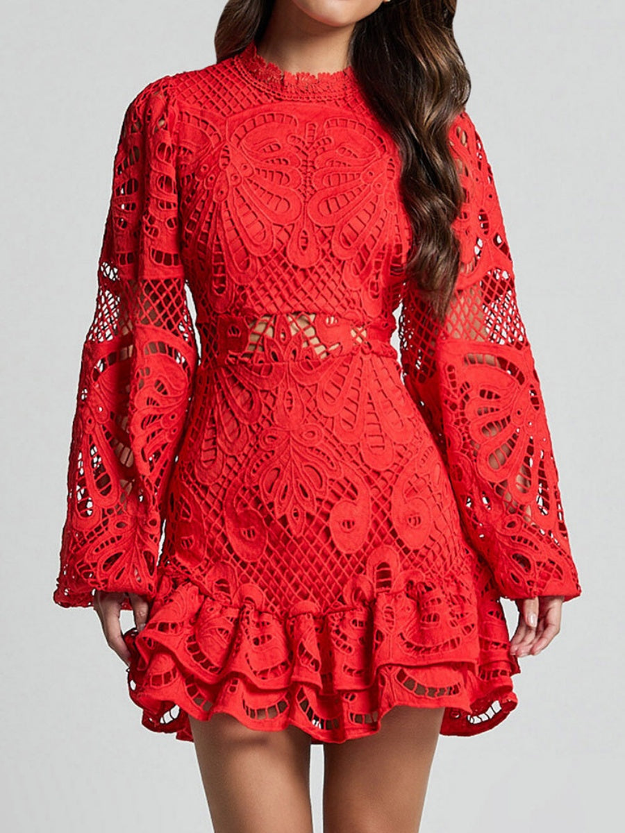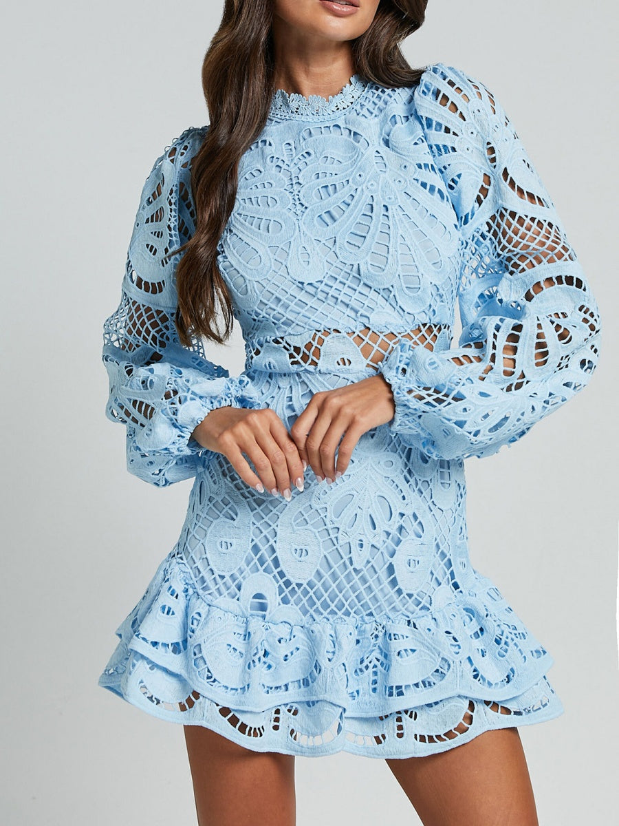 Robe longue à manches longues, coupe trapèze ajustée, style lanterne, ourlet à volants et dentelle hydrosoluble.