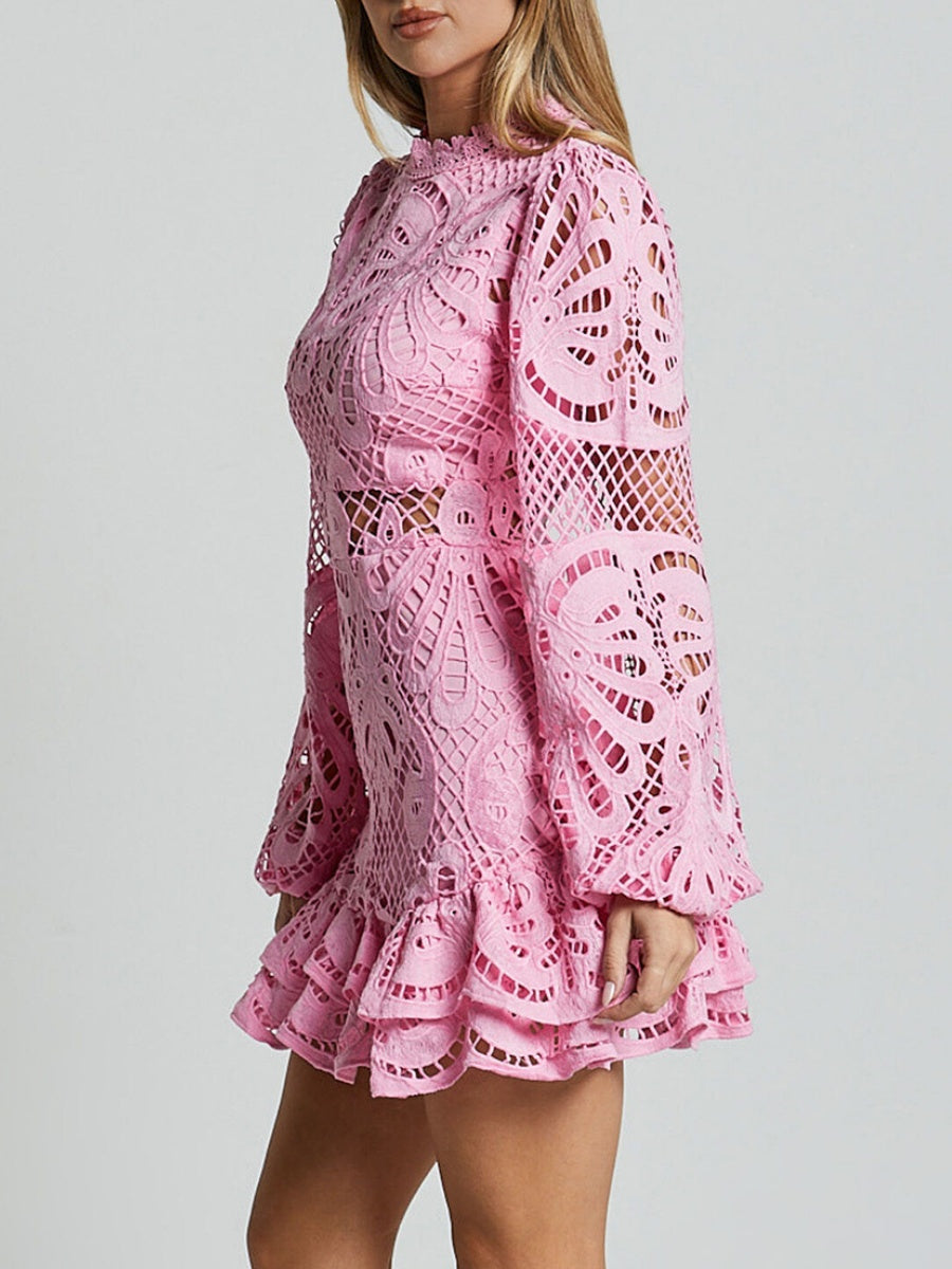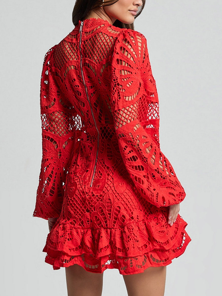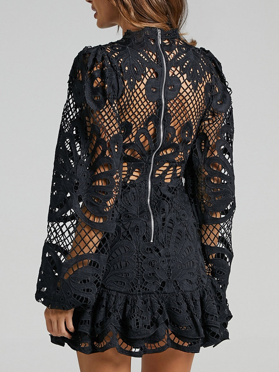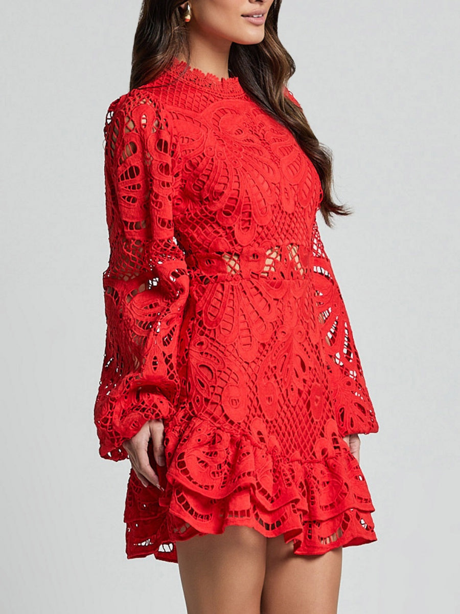 Robe longue à manches longues, coupe trapèze ajustée, style lanterne, ourlet à volants et dentelle hydrosoluble.