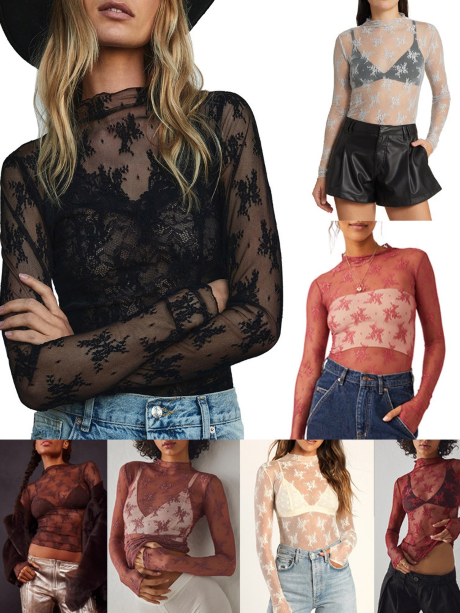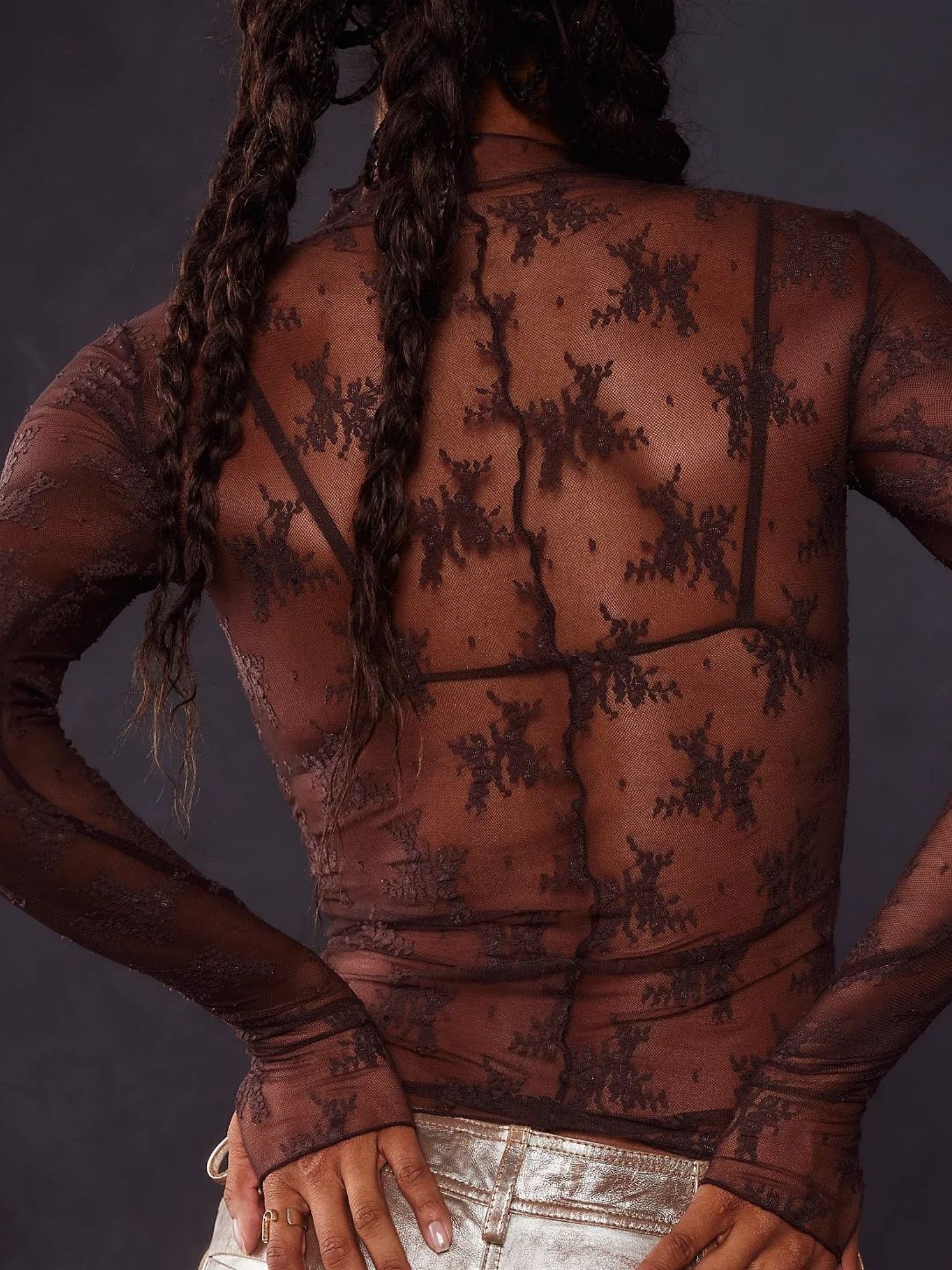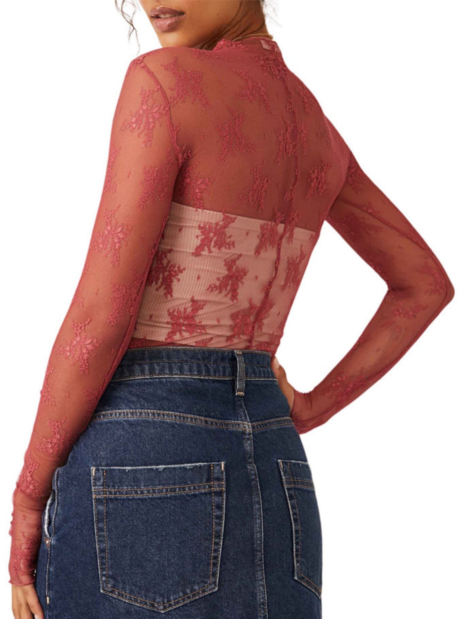 Lace See-through Sexy Mesh Mock Neck Long-sleeved Top