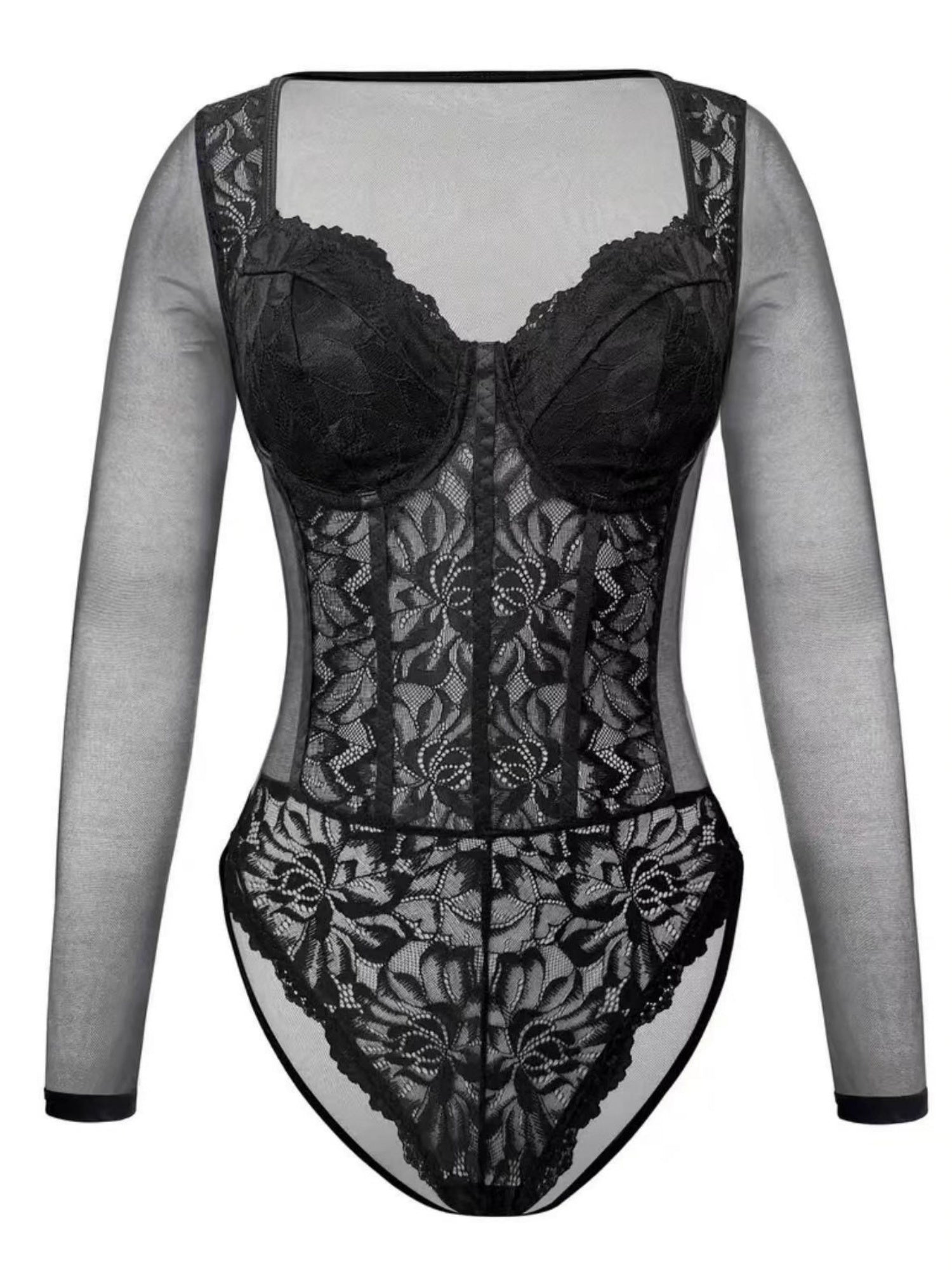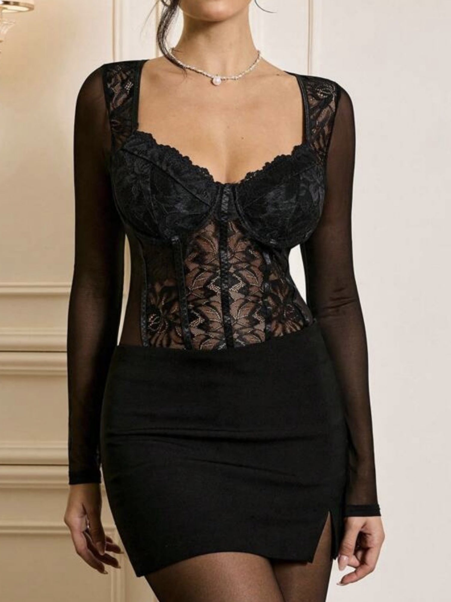 Body à manches longues en dentelle ajourée transparente et décolleté plongeant