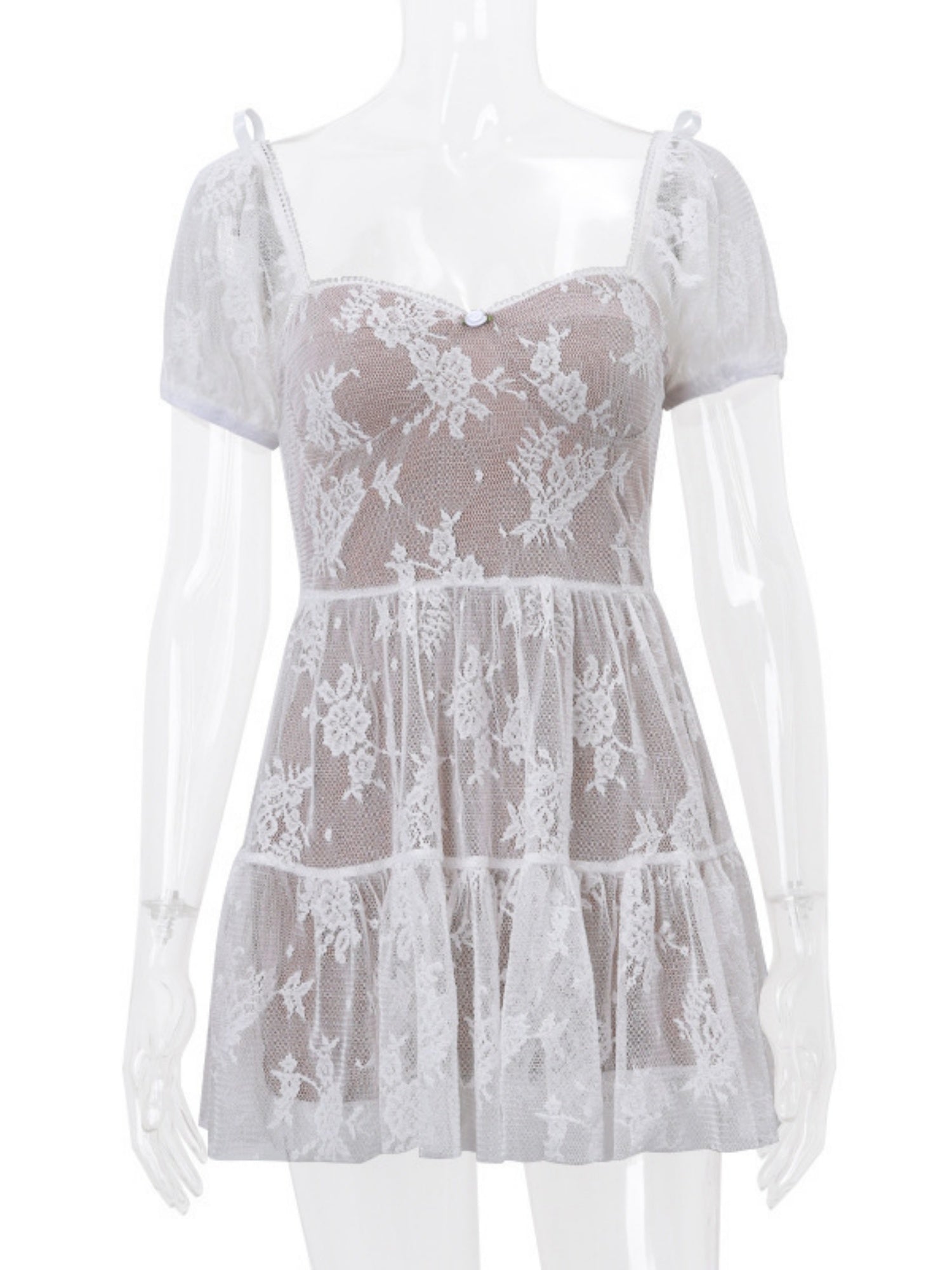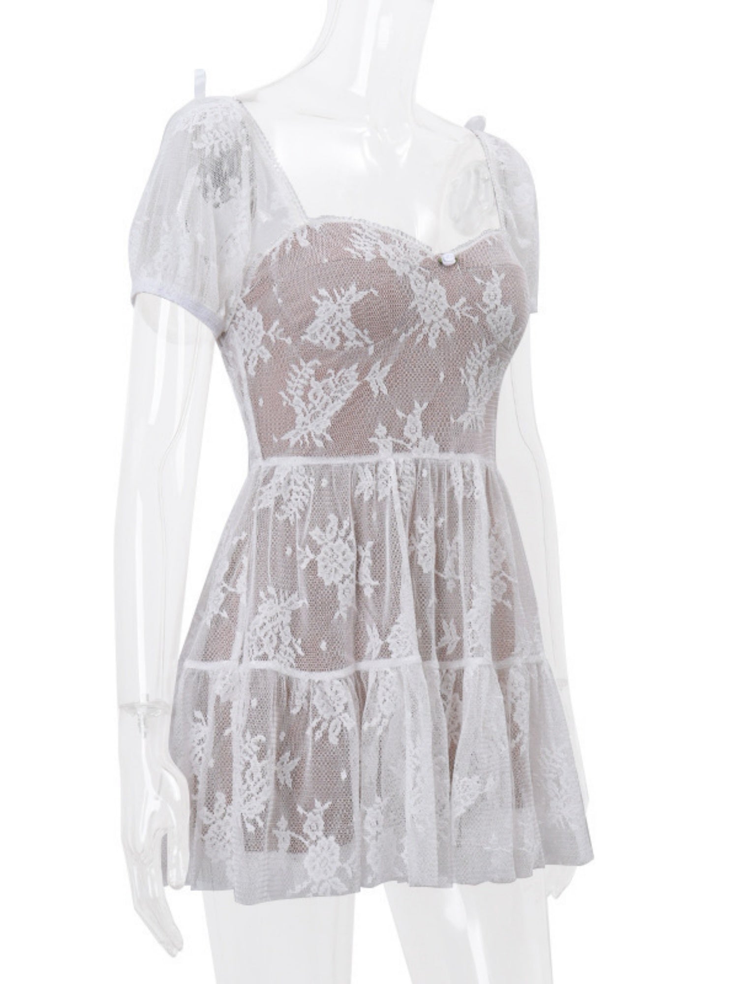 Floral Mesh Square Neck, Fitted Waist, Puff Sleeves Sweet Mini&Short Dresses