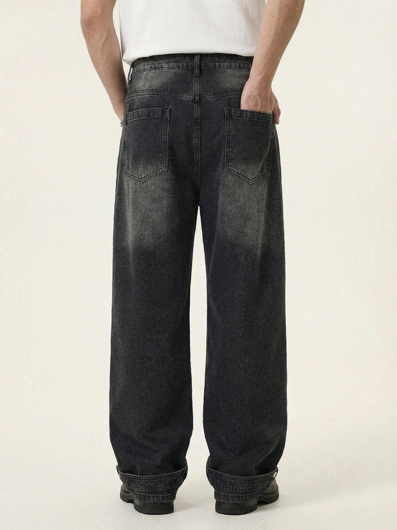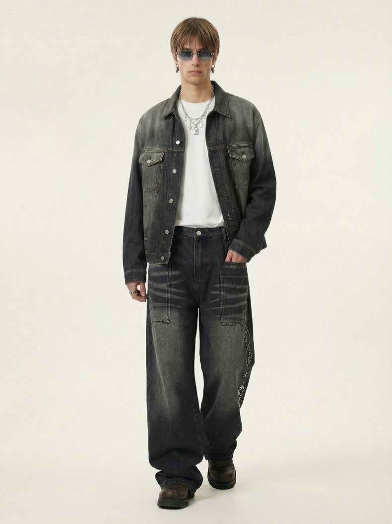 Black Cat Whiskers Sticker Bag Rhinestone-studded Distressed Wide-leg Jeans