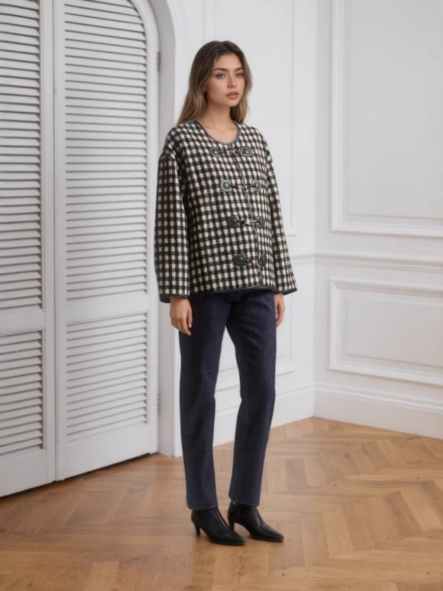 Liber Autumn women's houndstooth stitching round neck coat jacket