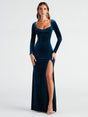 Square Neck Long-sleeved Velvet Strappy Backless Slit Formal Evening Midi Dress