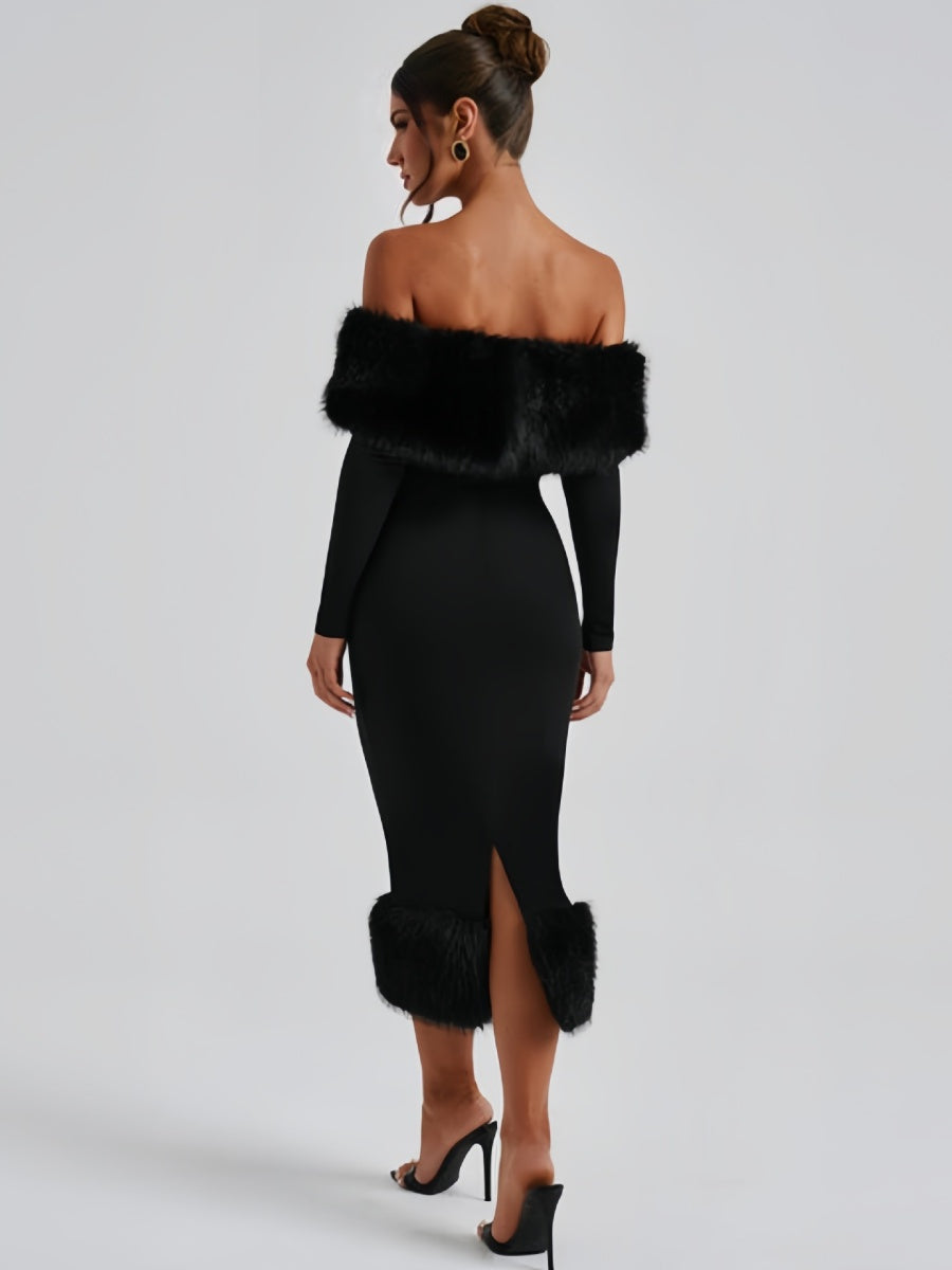 Fur Collar Patchwork Off Shoulder Hip-hugging Long Sleeve Parties Midi Dresses
