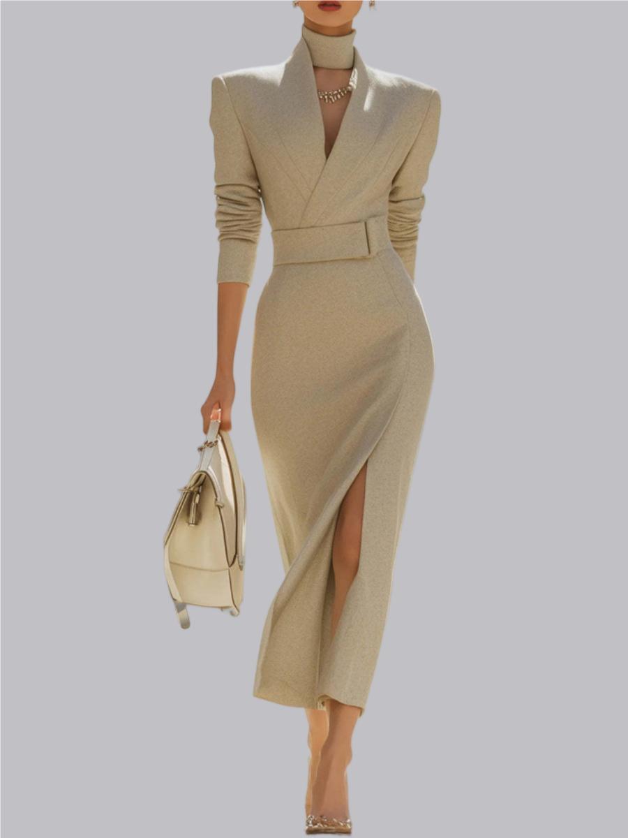 Hip-hugging Slit V-neck Belts&Chain Midi Dresses
