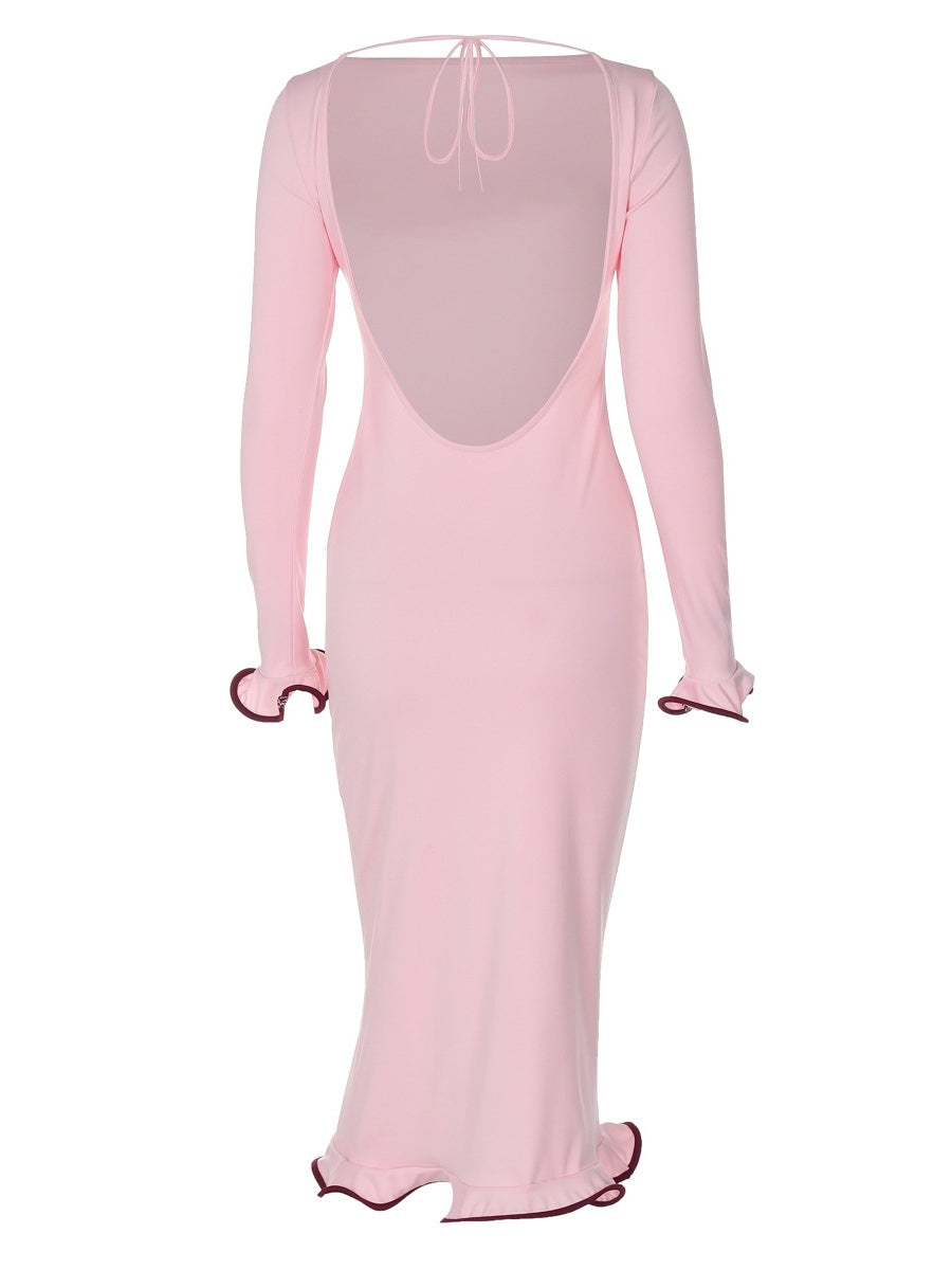 Backless Bell Sleeves Ruffled Skirt Knitting Sexy Color-blocked Long Dress