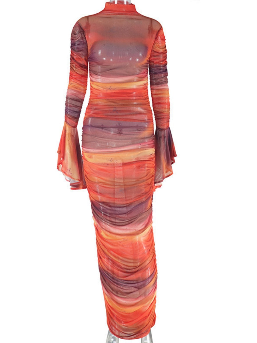 【SHIP AS USUAL】 Print Flared Long Sleeves Crew Neck Hip-hugging Maxi Dresses