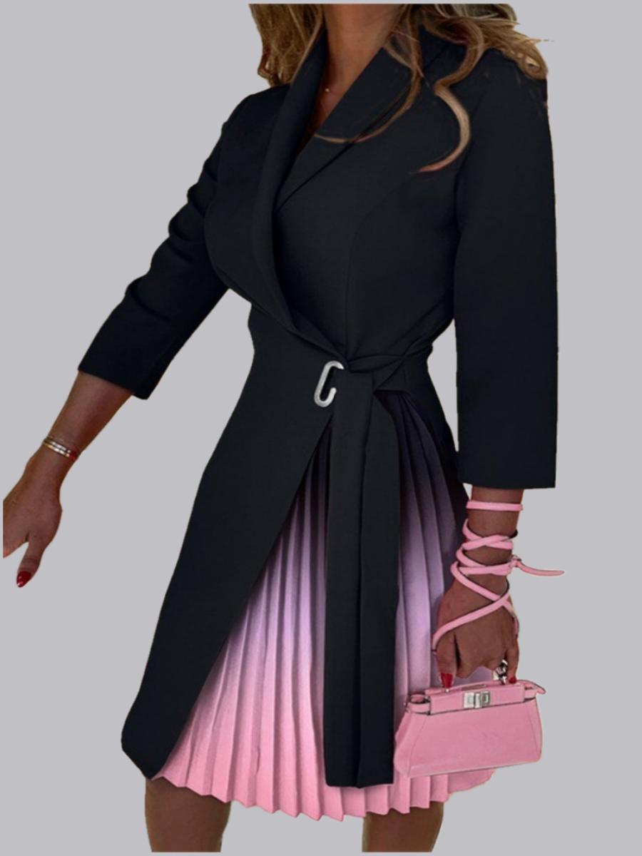 V-neck Tie-waist Cinched Mid-length Sleeves With Pleats Gradient Print Mini&Short Dresses