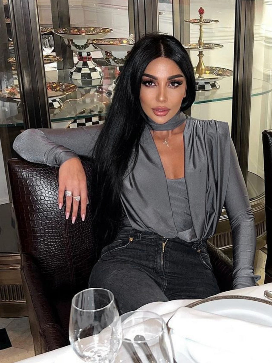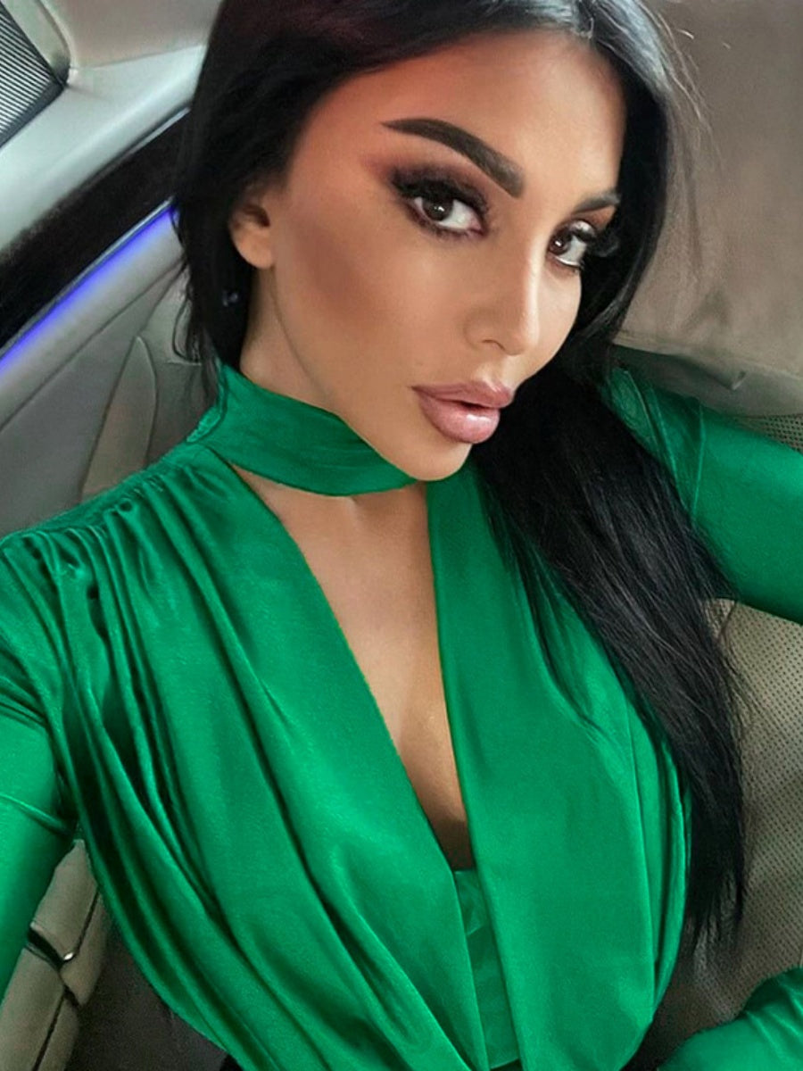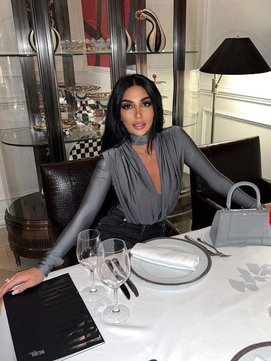 V-neck Slim Fit Pleated Decoration Base Layer Splicing Long-sleeved Bodysuit