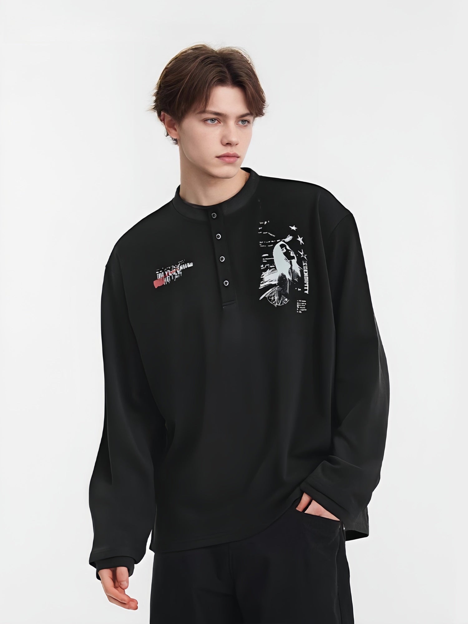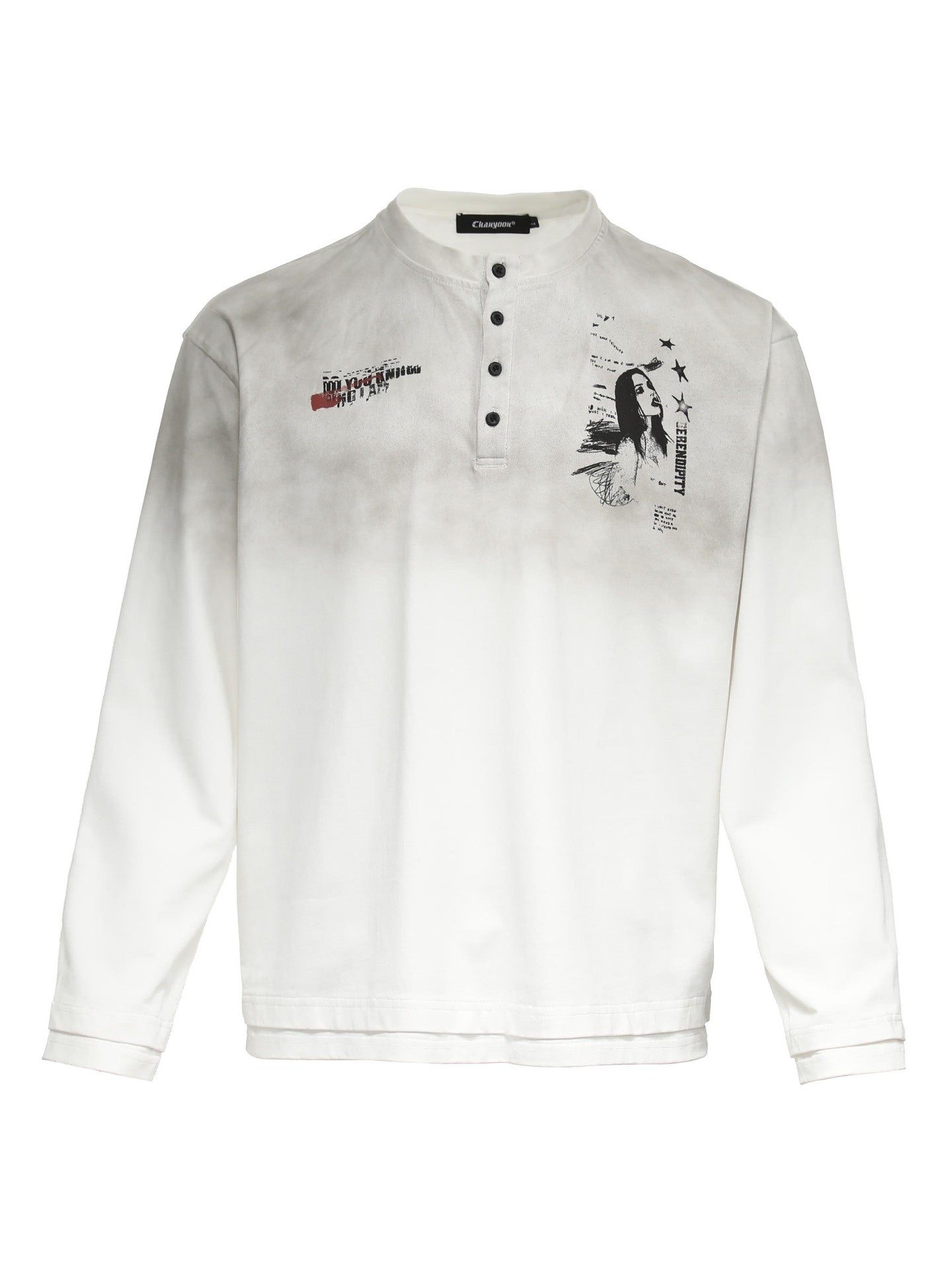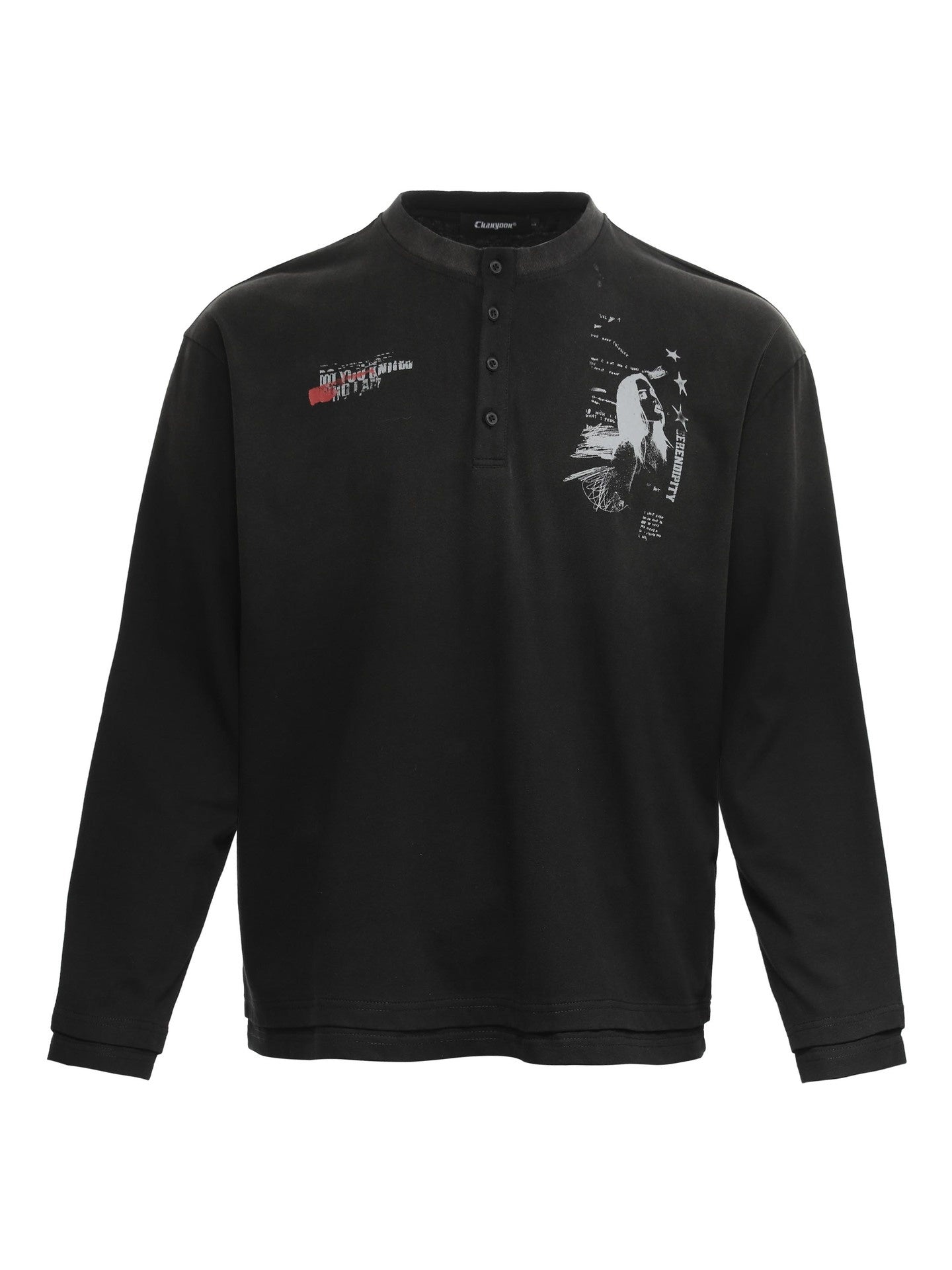 Retro European And American Portrait Prints Distressed Henry Collar Fake Two Pieces Long-sleeved T-shirt