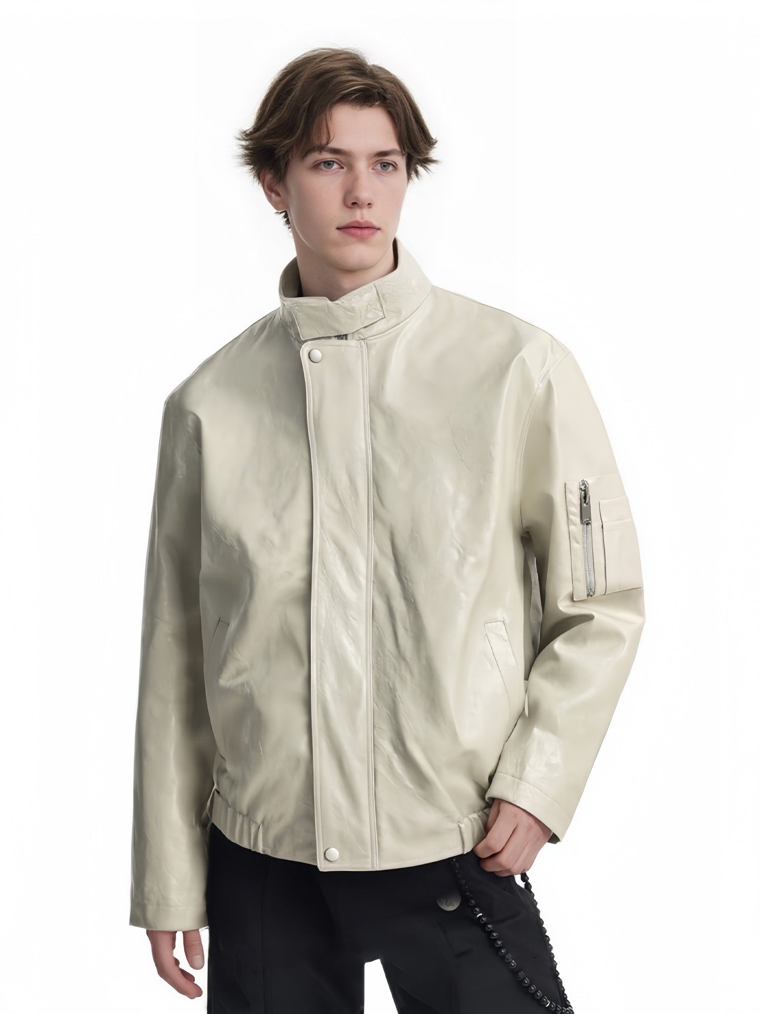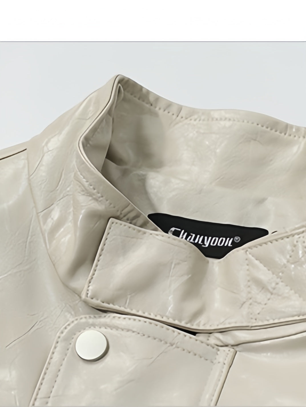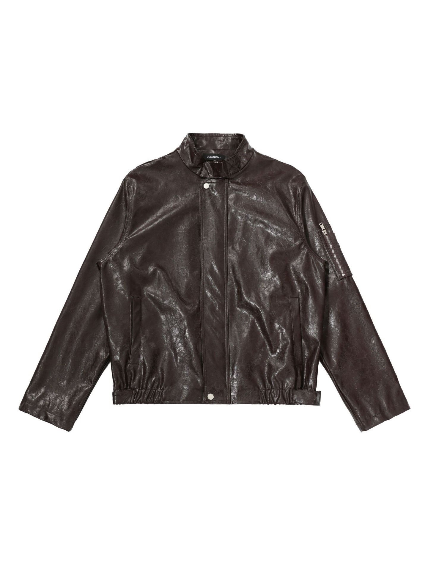 Retro Old Money Style Brown Cleanfit Silhouette Stand Collar Leather Jacket