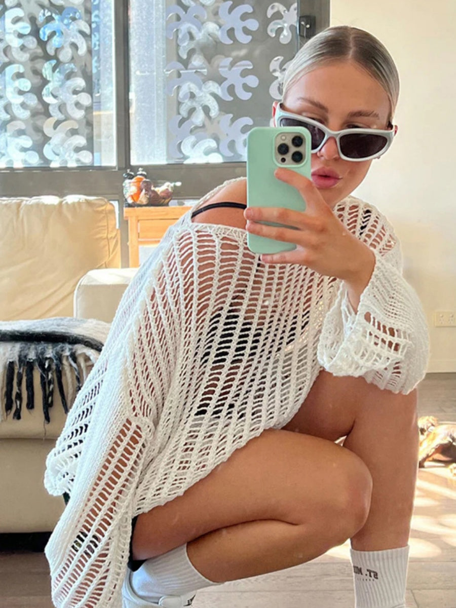 Liber Autumn women's see-through knitted loose hollow pullover mesh see-through top