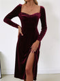 Long-sleeved Square Neckline Burgundy Velvet Slit Formal Dinner Cocktail Party Christmas Midi Dress