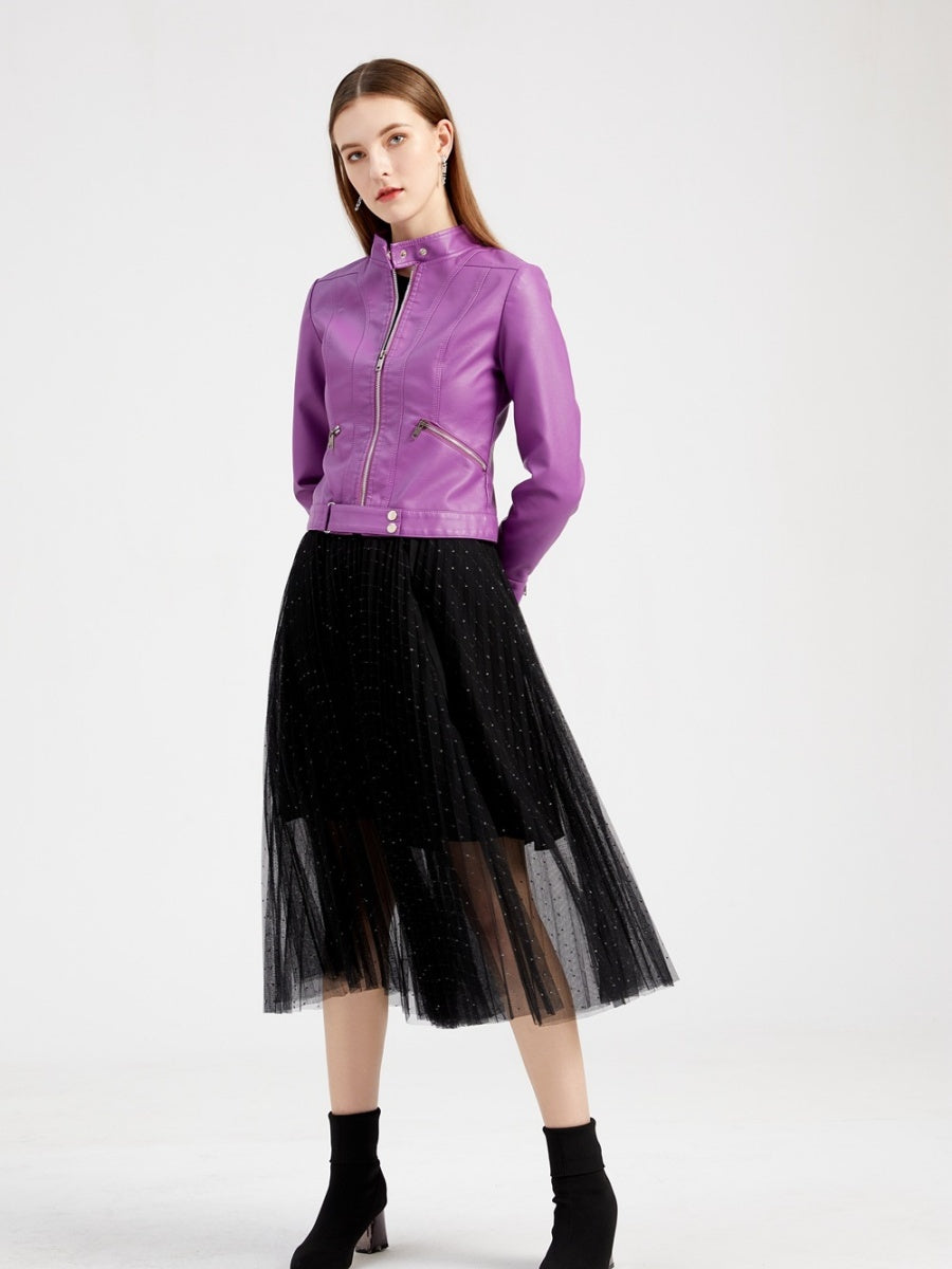 Three-dimensional Decoration Short Stand Collar Zippered Leather Jacket