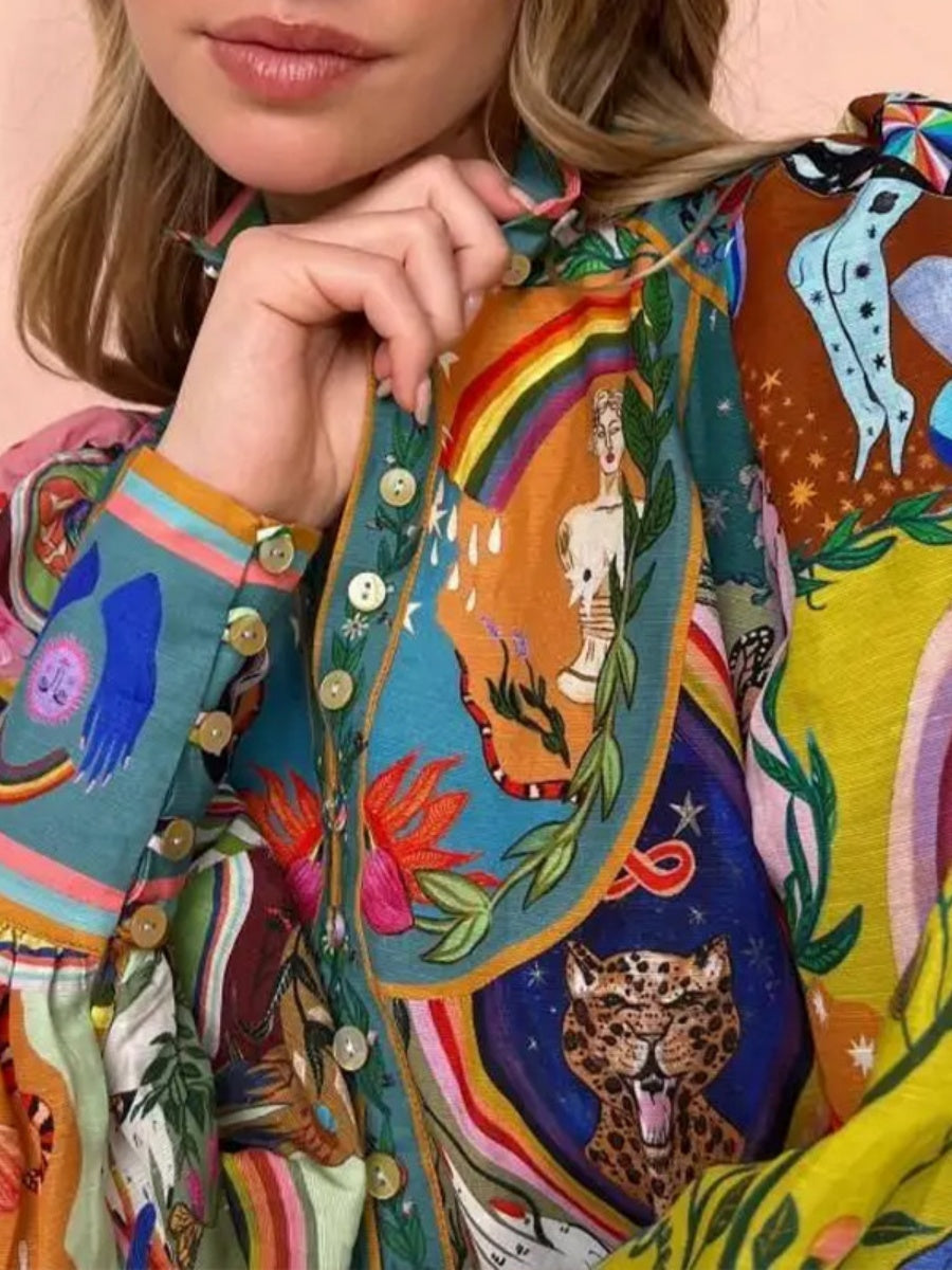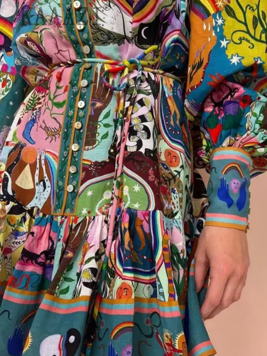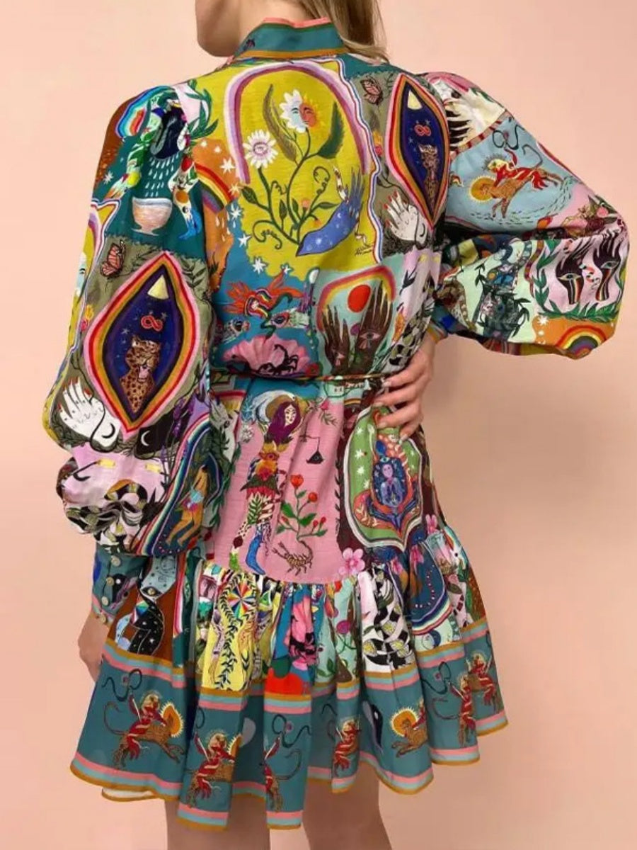 Painting Plants And Flowers Crew Neck Waist Lace Up Pleated Long Sleeve Mini&Short Dresses