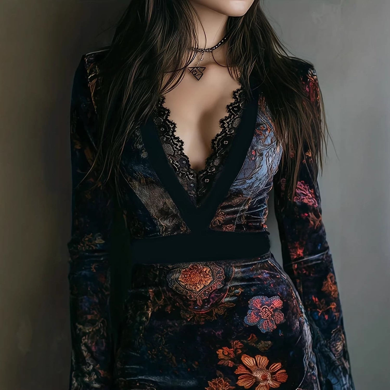 V-neck Lace Trim Printed Long Sleeve Hip-hugging Mini&Short Dresses