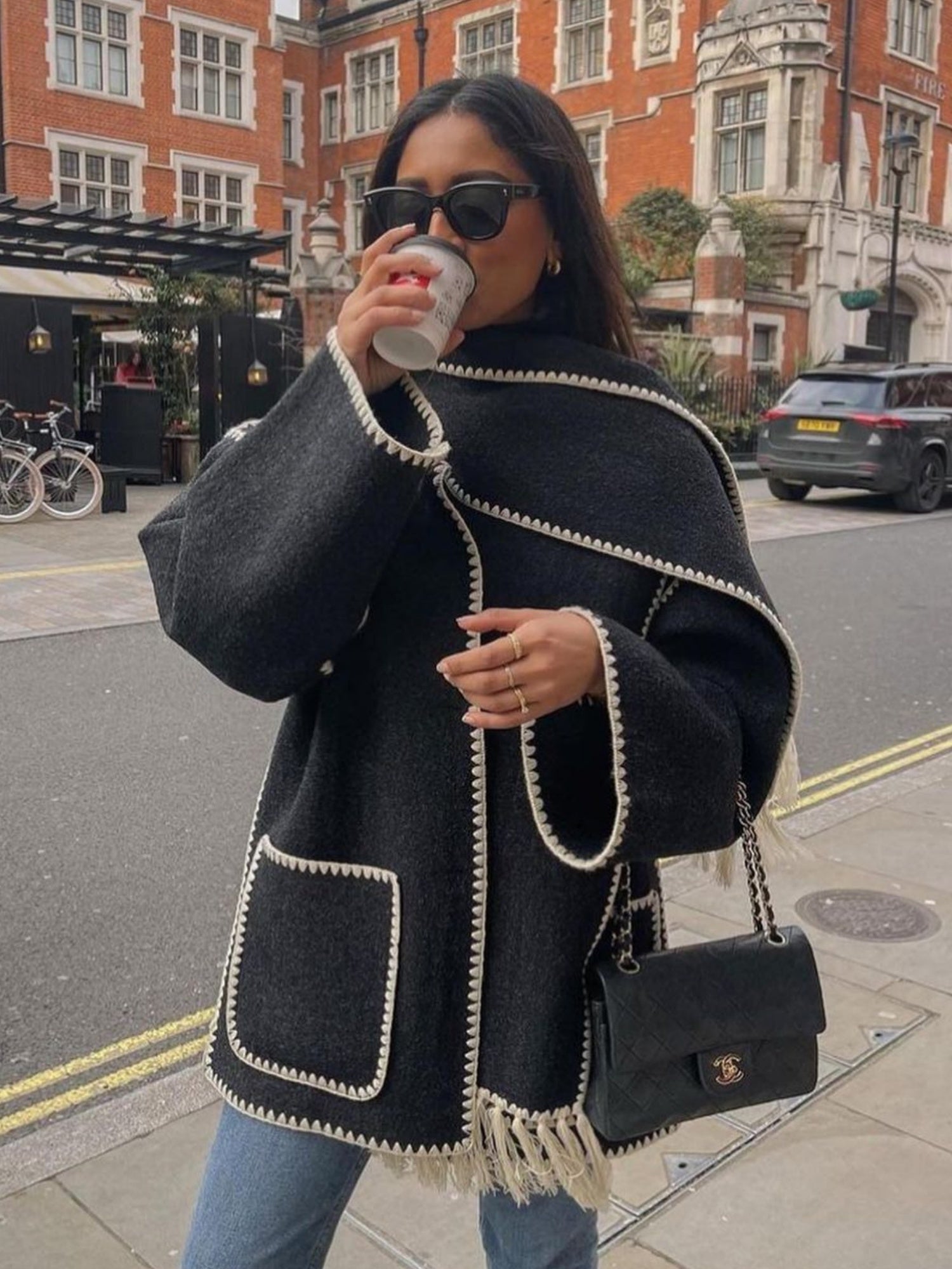 Wool Coat With Scarf And Tassels, Warm And Thick For Autumn And Winter.