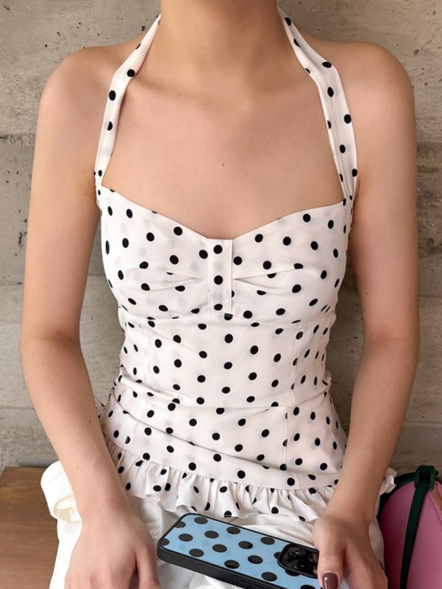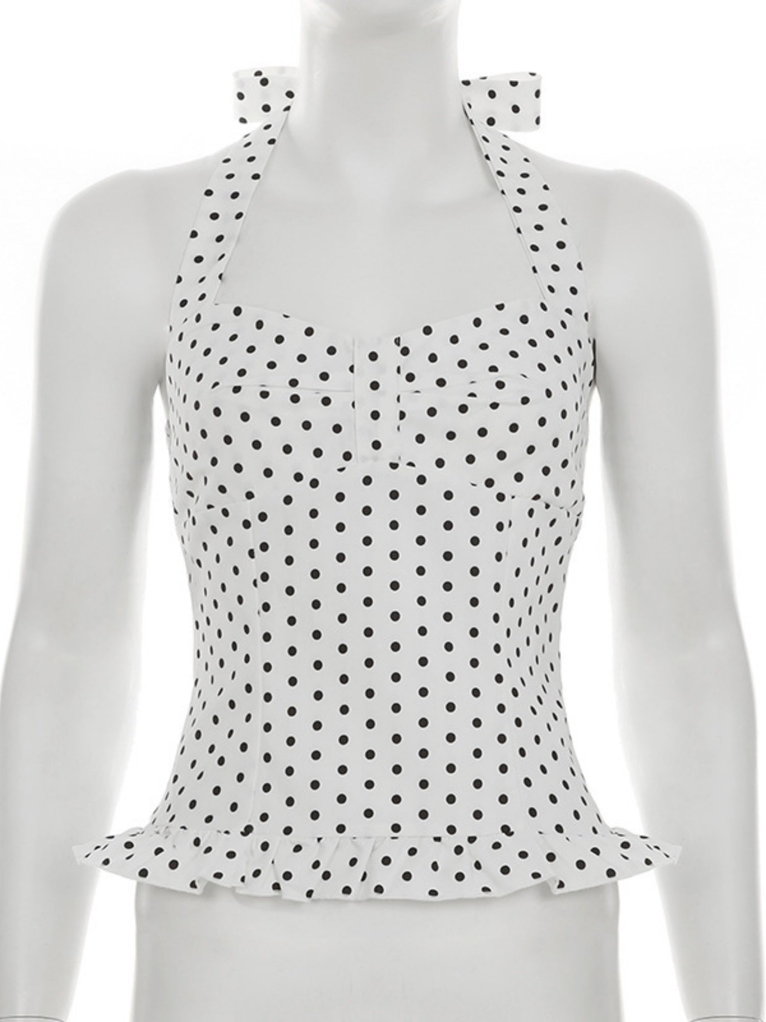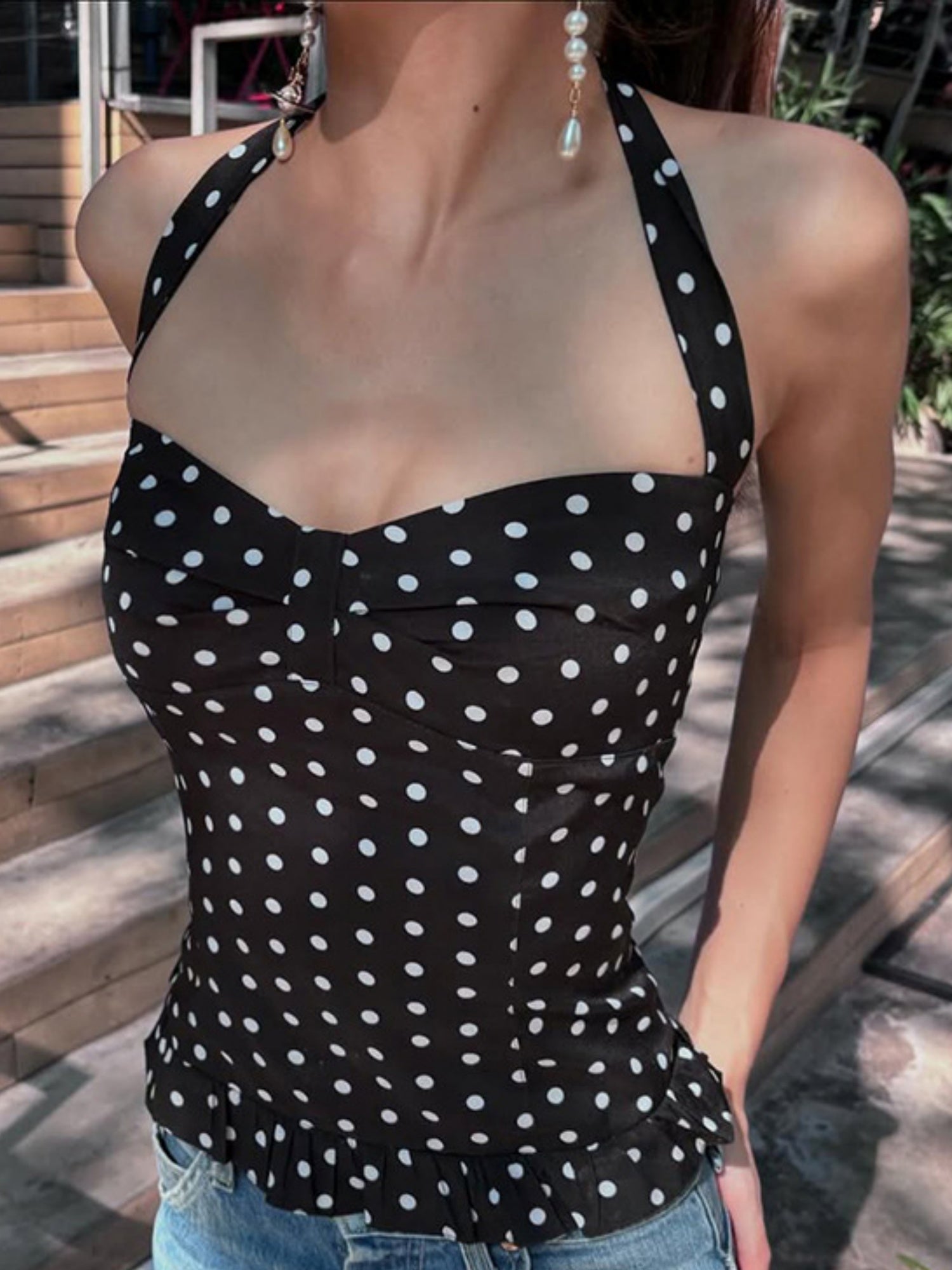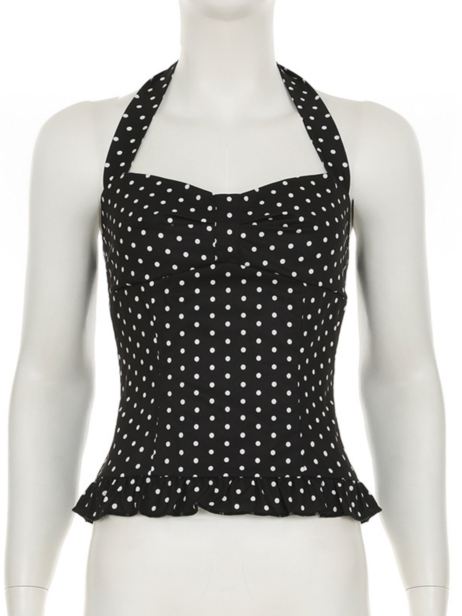 Polka Dots Wavy Lace Chest Pleats Neck Strap Tank Tops&Camis
