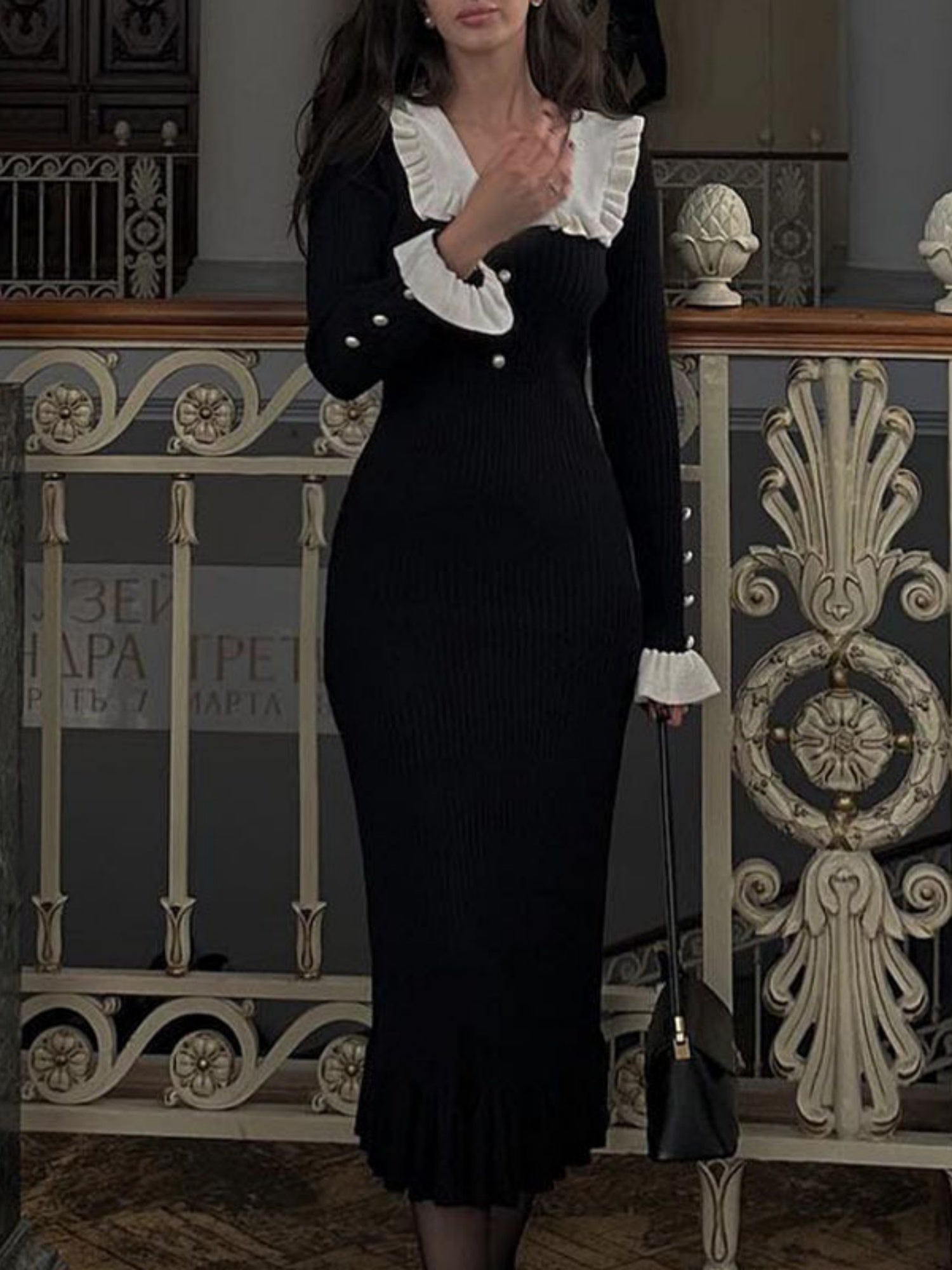 Ruffled Retro Splicing Ladies French Lapel Long Dress Knitted Skirt Sweater Dress