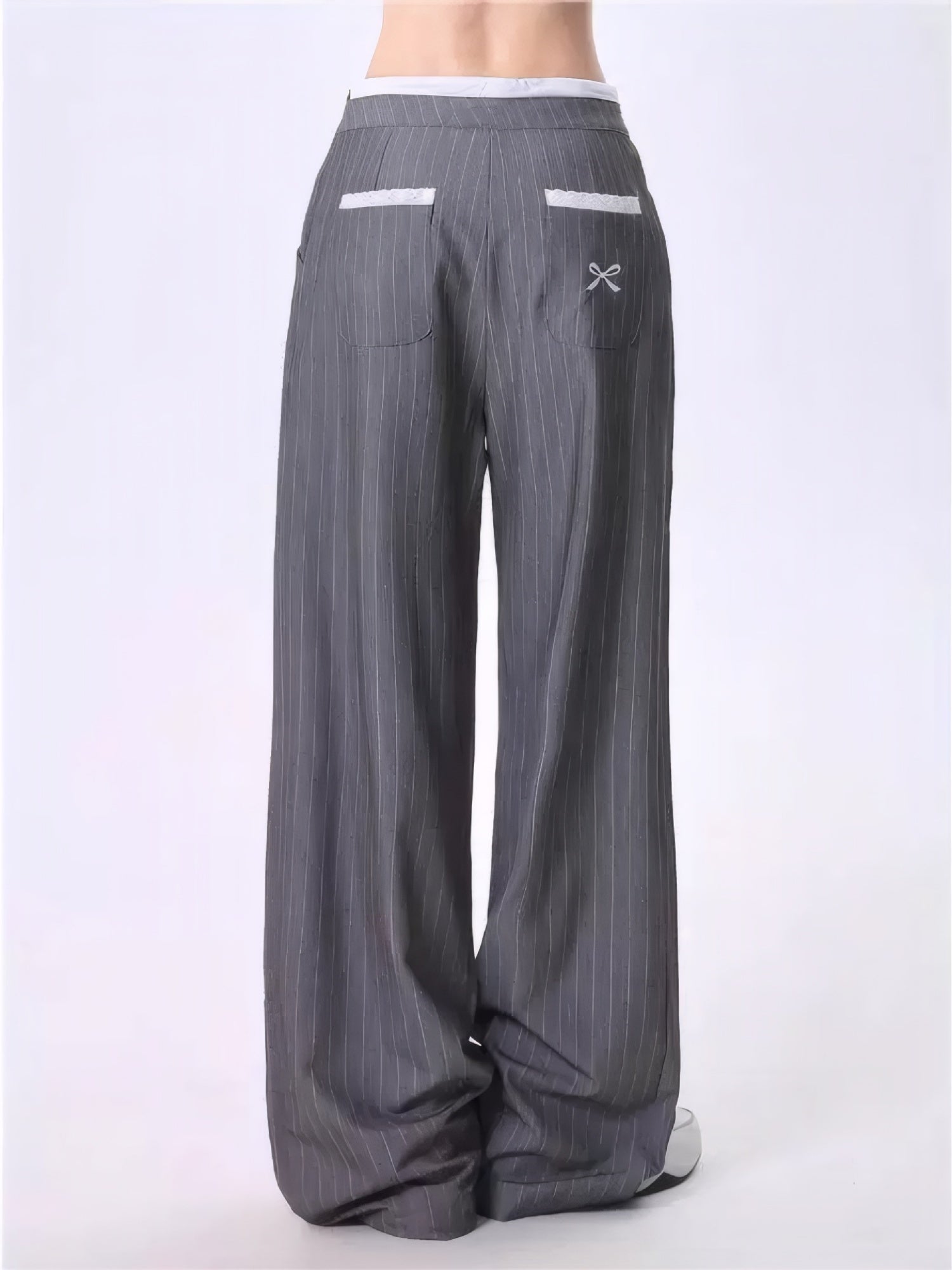 Striped Bow Tie Wide-leg Pants Casual High-waist Straight Gray High-end Summer Suit Trousers