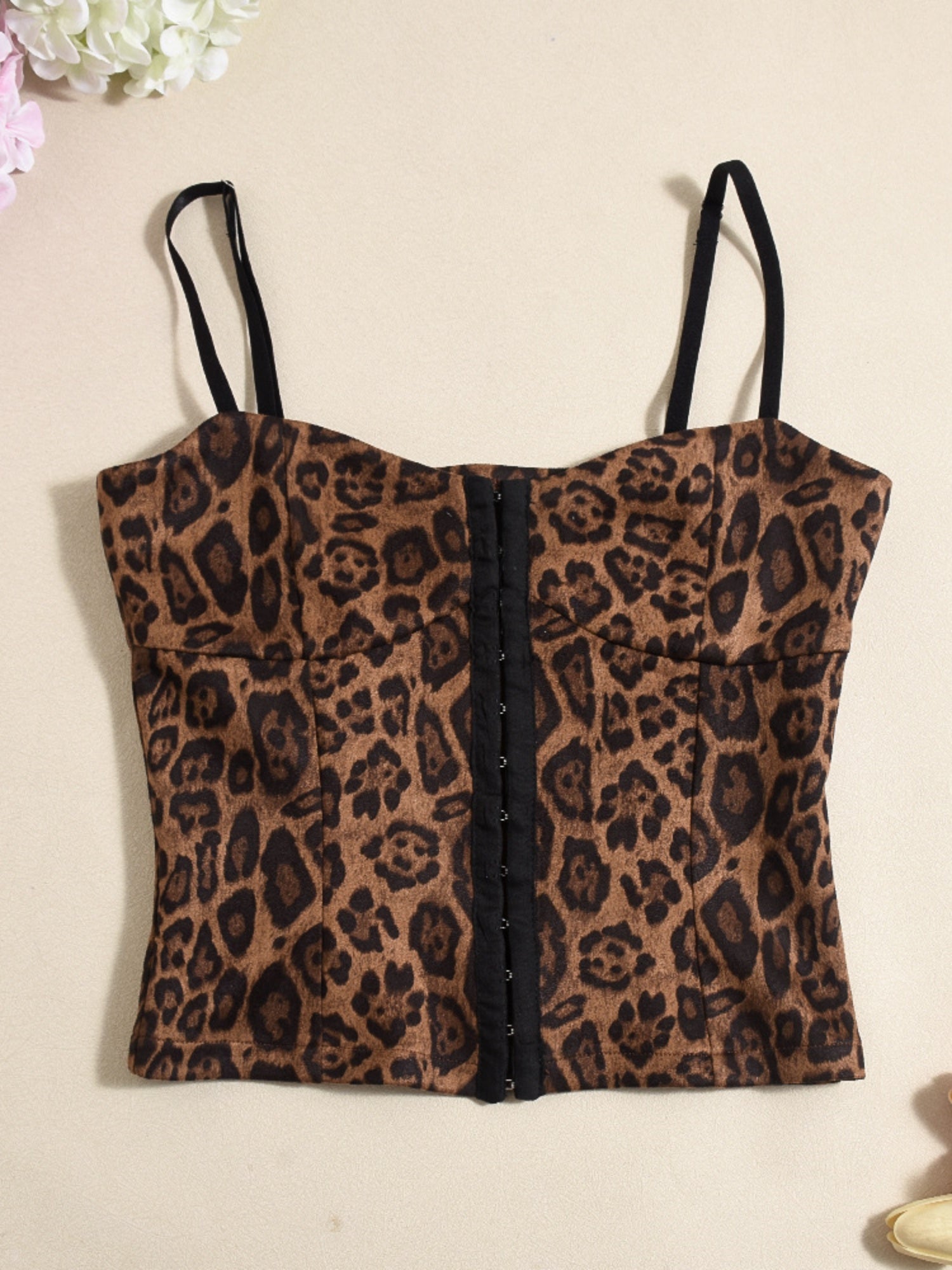 Liber Leopard Print Buttons Hollow Out Suede Tank Tops&Camis