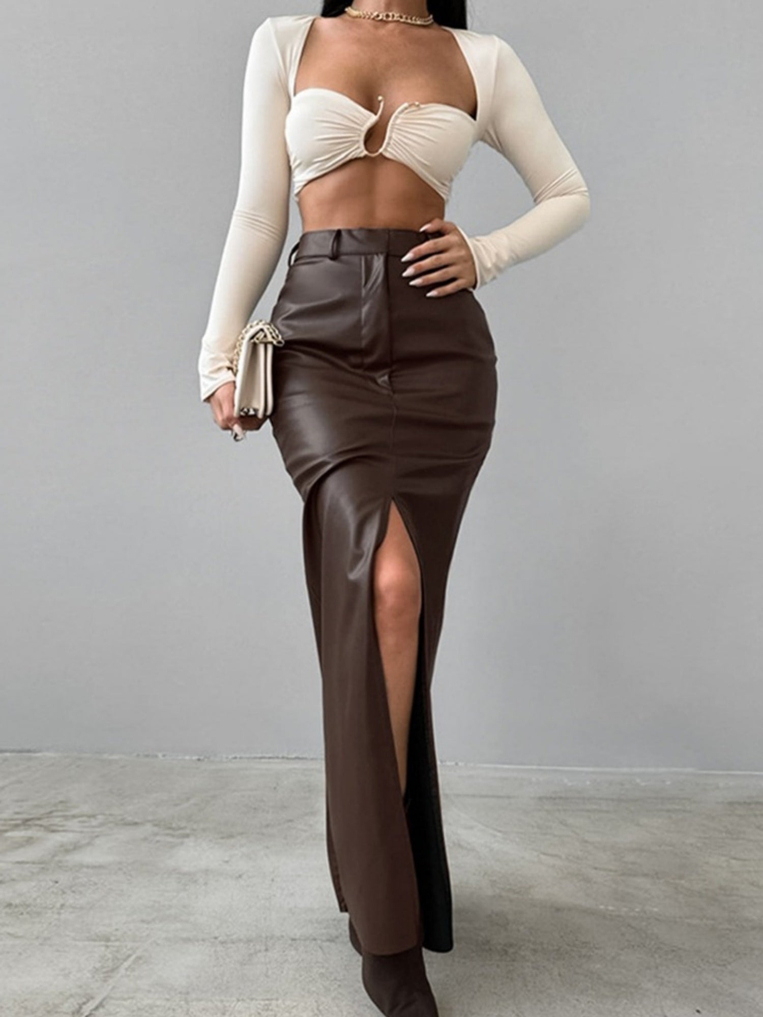 Leather Stitching High-waisted Slim Fit Hip Body Slit Long Skirts