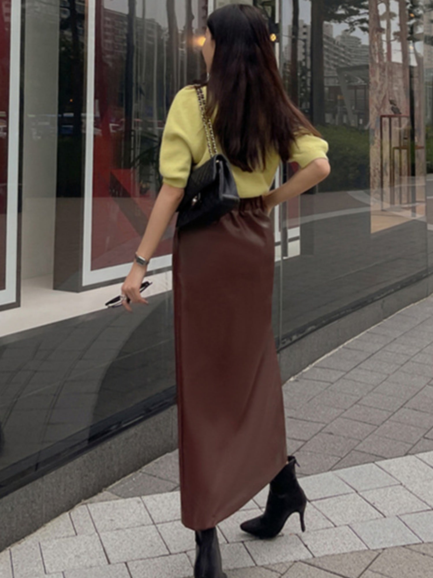 Leather Stitching Buttons Pleated High-waisted Side Slit Long Skirts