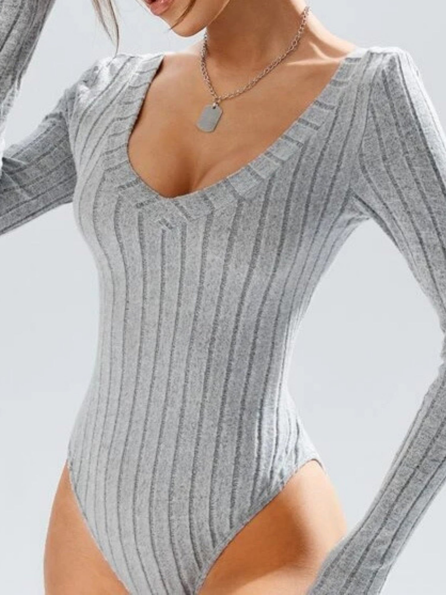 V-neck Long-sleeved Knitted Brushed Ribbed Bodysuit Top
