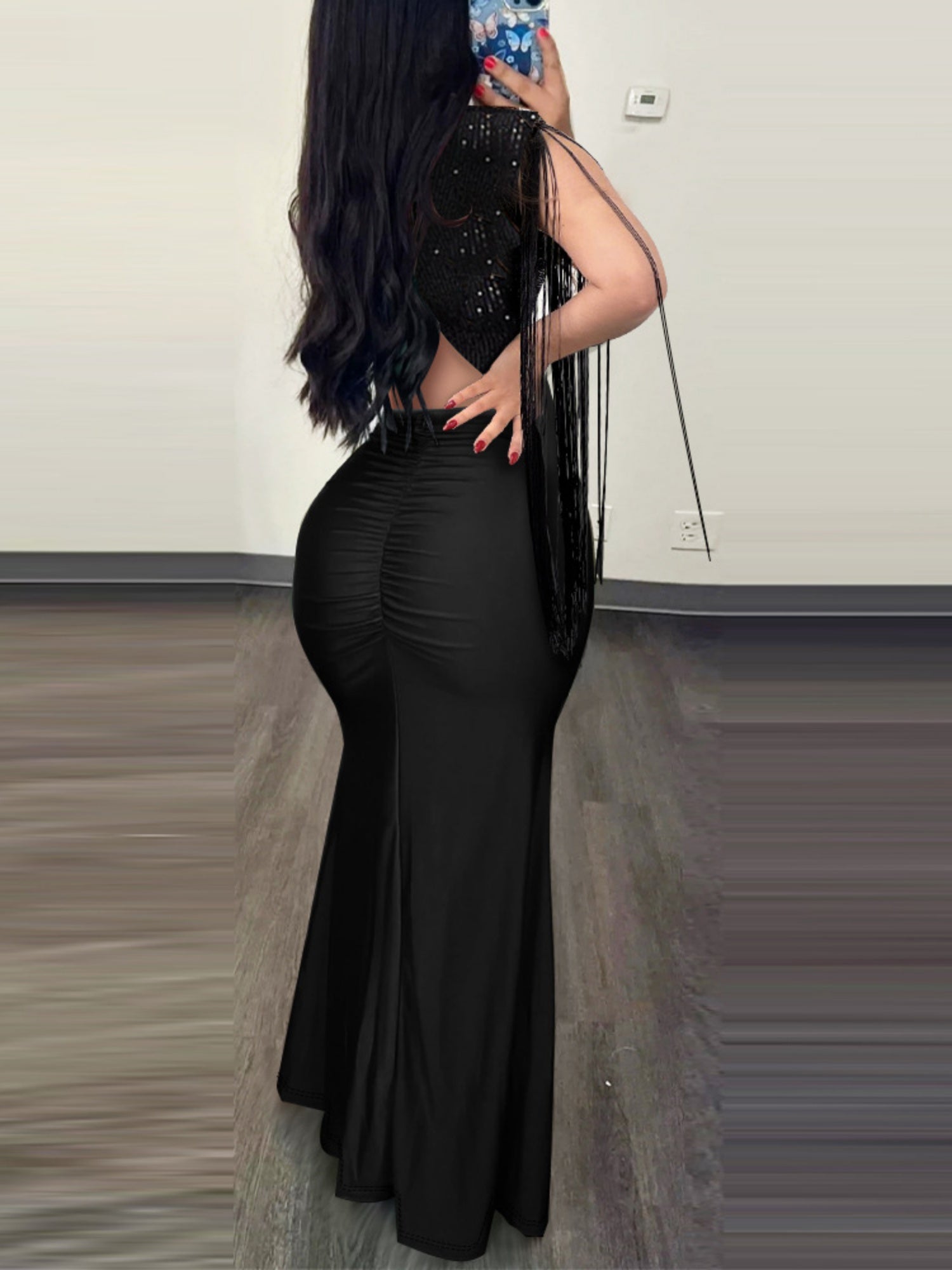 Sequins Bodycon Round Neck Slit Evening Dress Tassel Sleeves Pleated Maxi Dresses