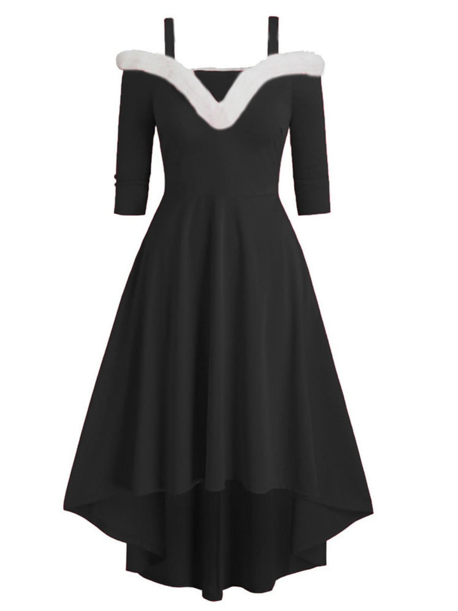 Christmas Plush Splicing High And Low Deep V Off-shoulder Large Skirt Three-quarter Sleeves Midi Dresses