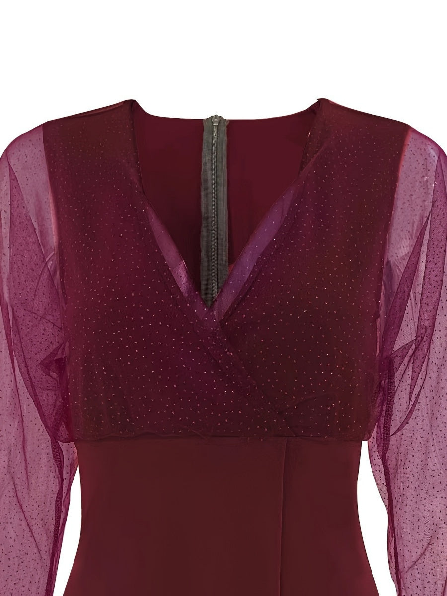 - Details: Mesh paneling, long sleeves, sequins, A-line silhouette – sexy, elegant, perfect for a party.
