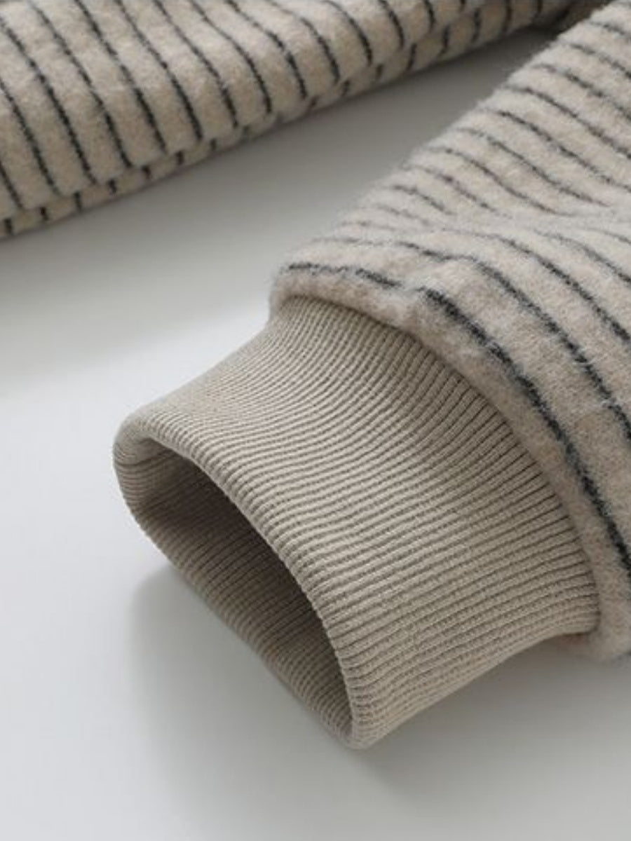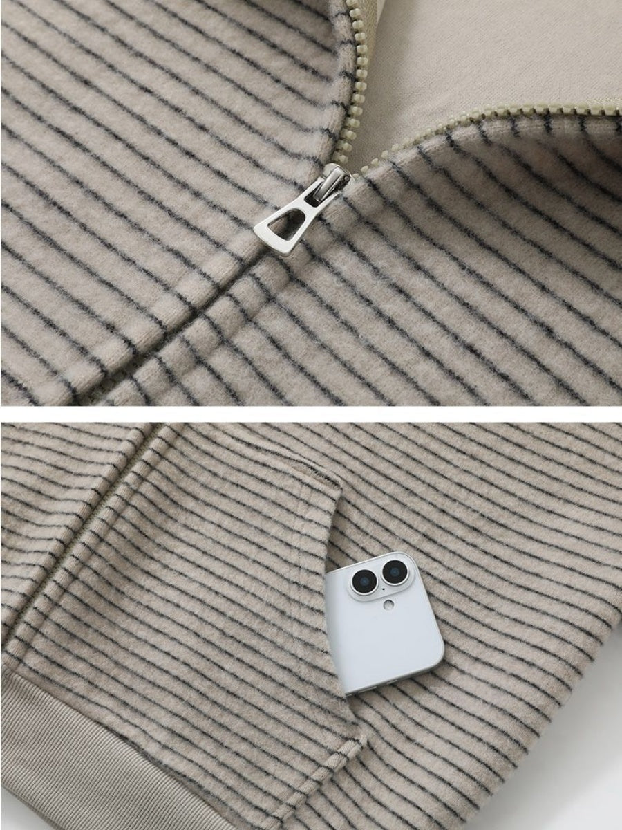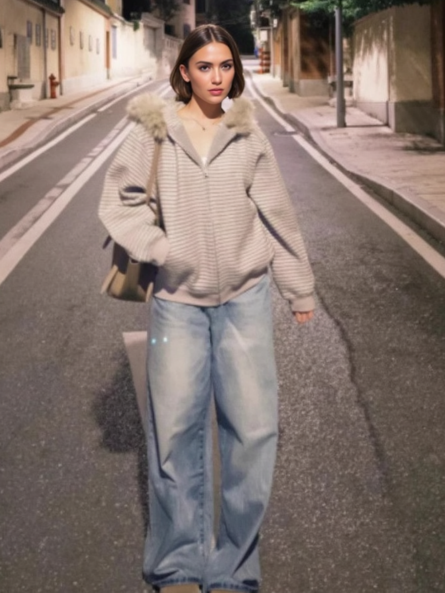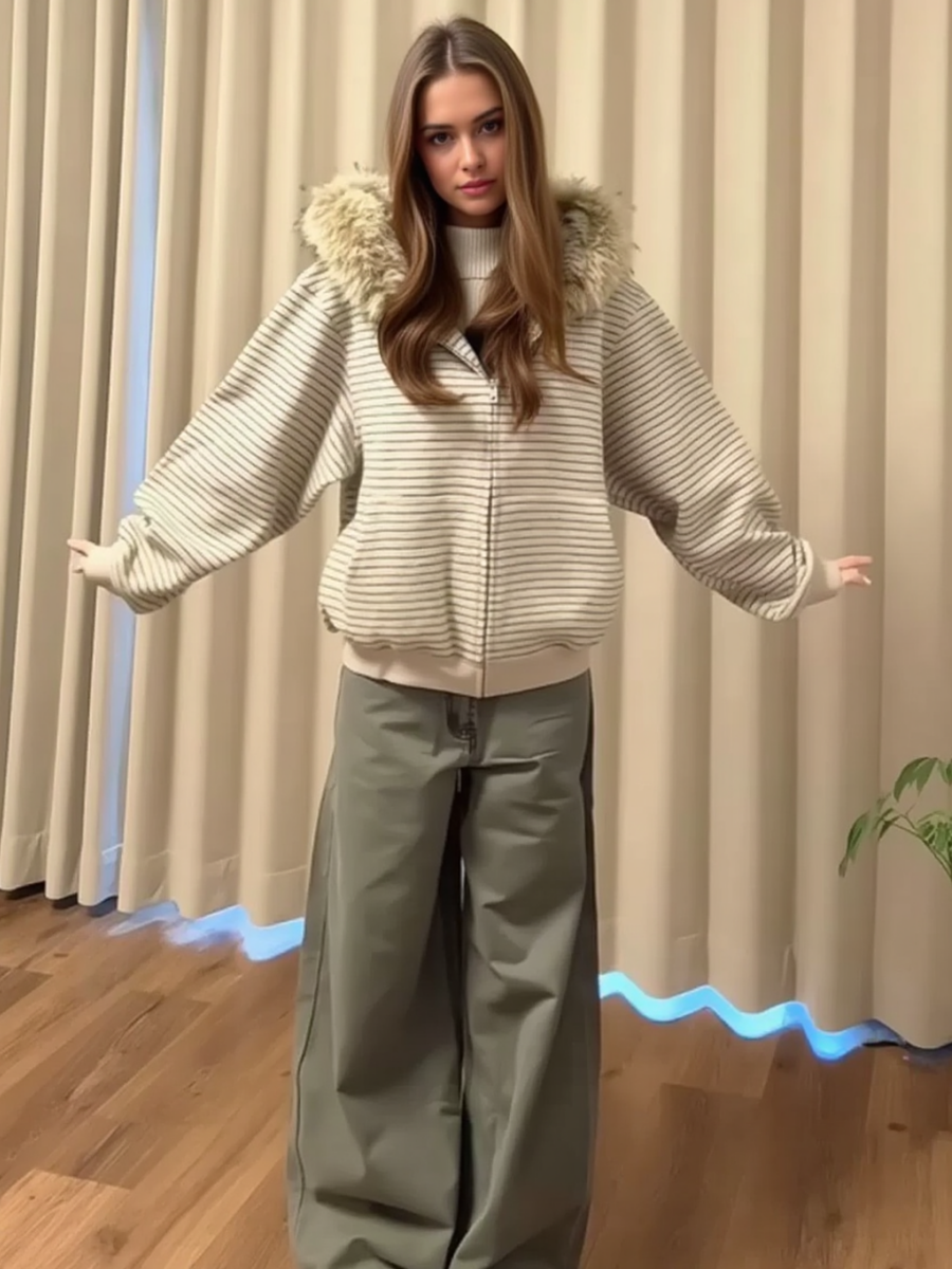 - Details: Zippered, striped, detachable large fur collar, retro casual jacket