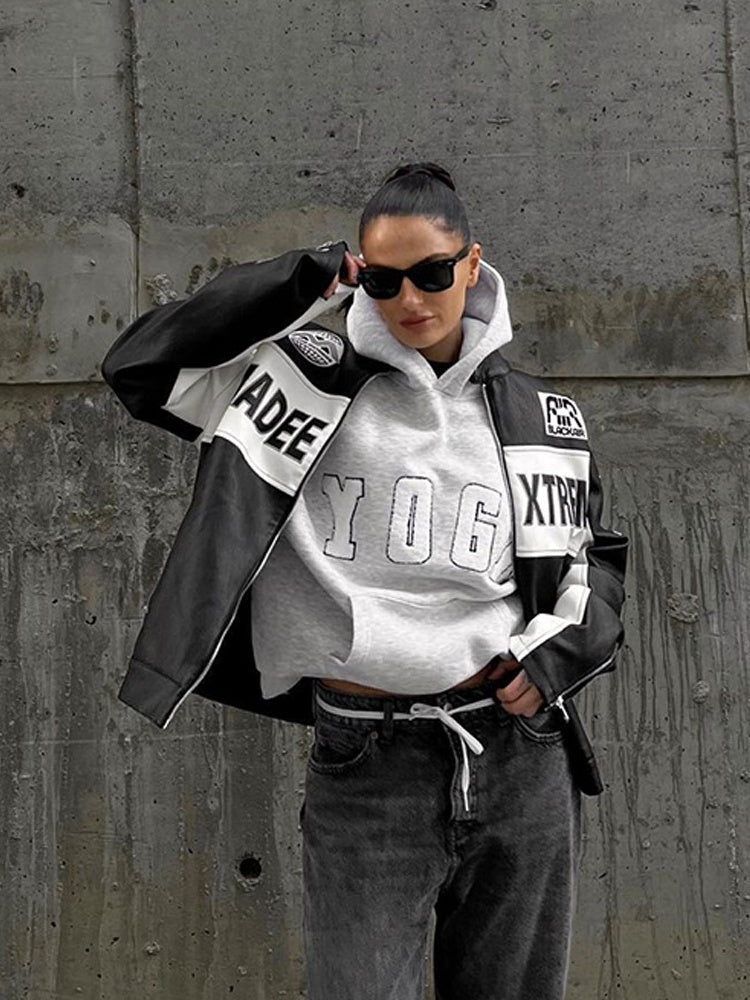 Grey Embroidered YOGA Letter Print Oversized Hooded Sweatshirt