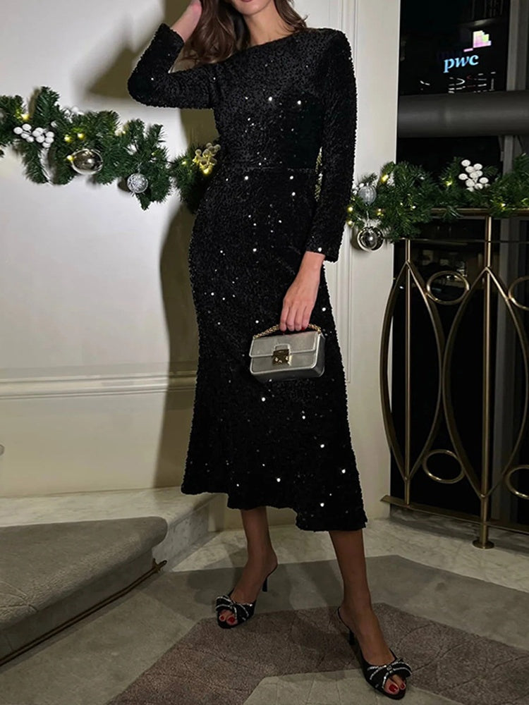 Slim Fit Velvet Sequins Long Sleeve Maxi Dresses