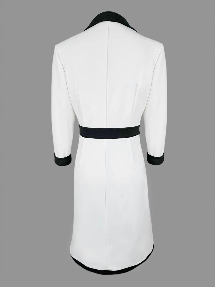 French Lapel Black And White Color Blocking High Waist Three-quarter Sleeves Workplace Midi Dresses
