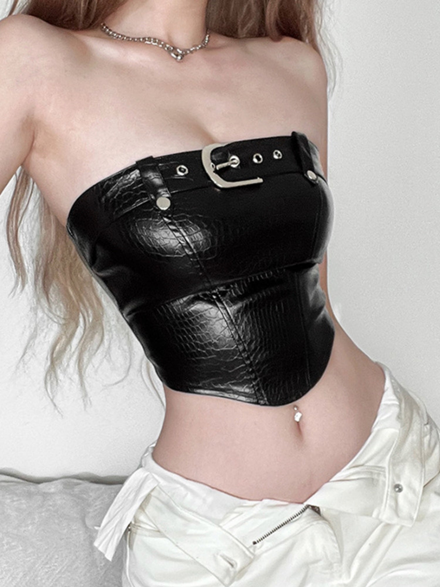 PU Leather Snake-print Leather Buckle Tube Top