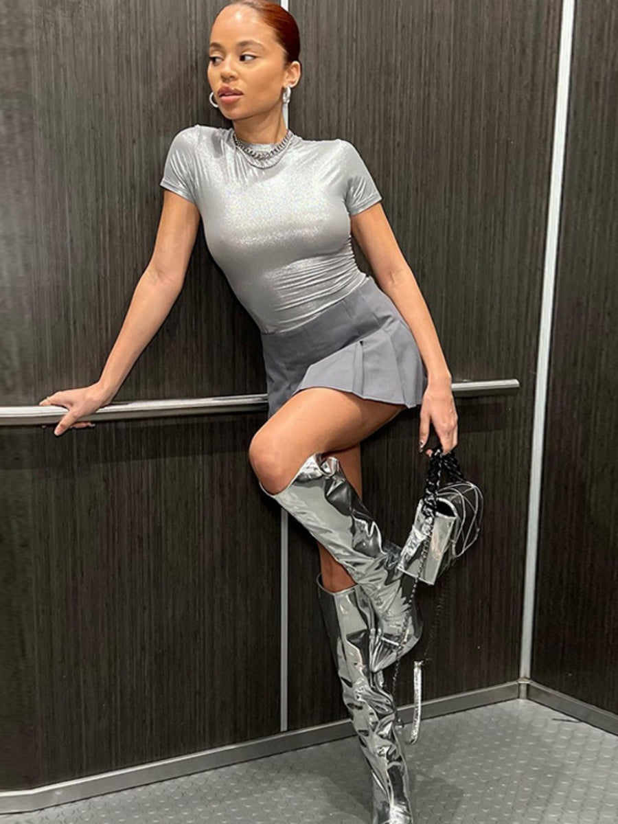 Metallic Color Crew Neck Short Sleeve Tight Fit T-shirts