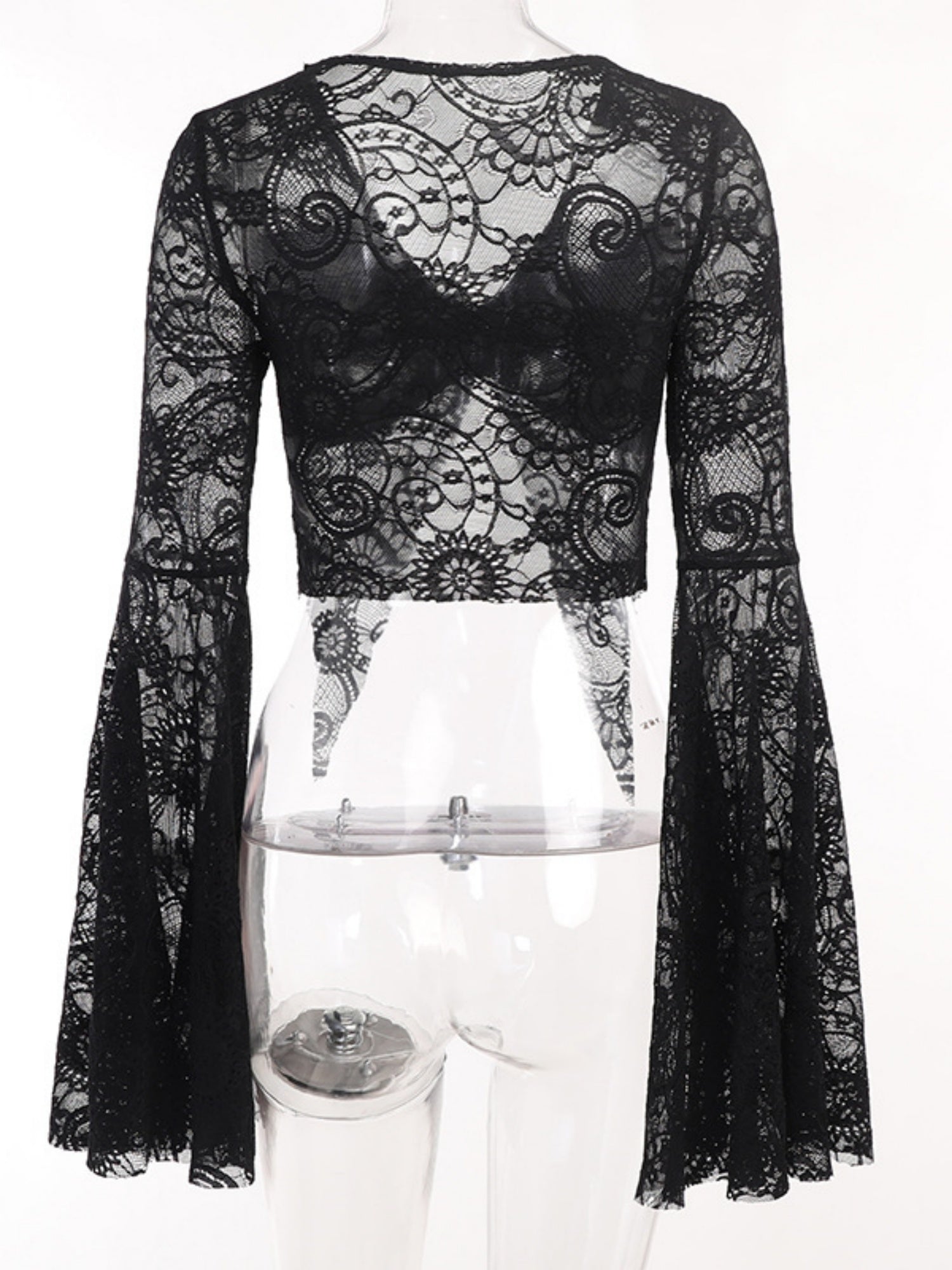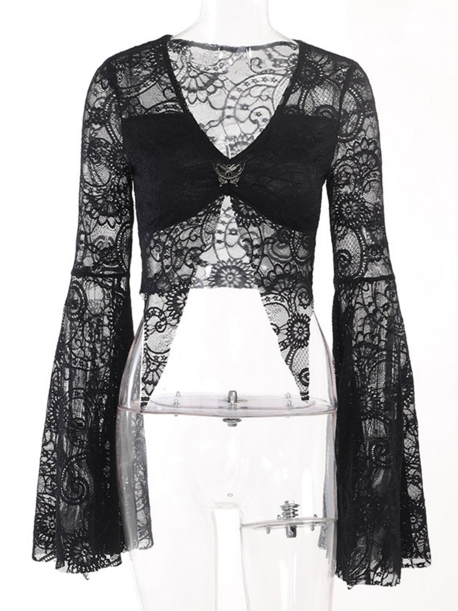 Y2K Lace Flare Sleeve Slit And Exposed Navel Long-sleeved T-shirt