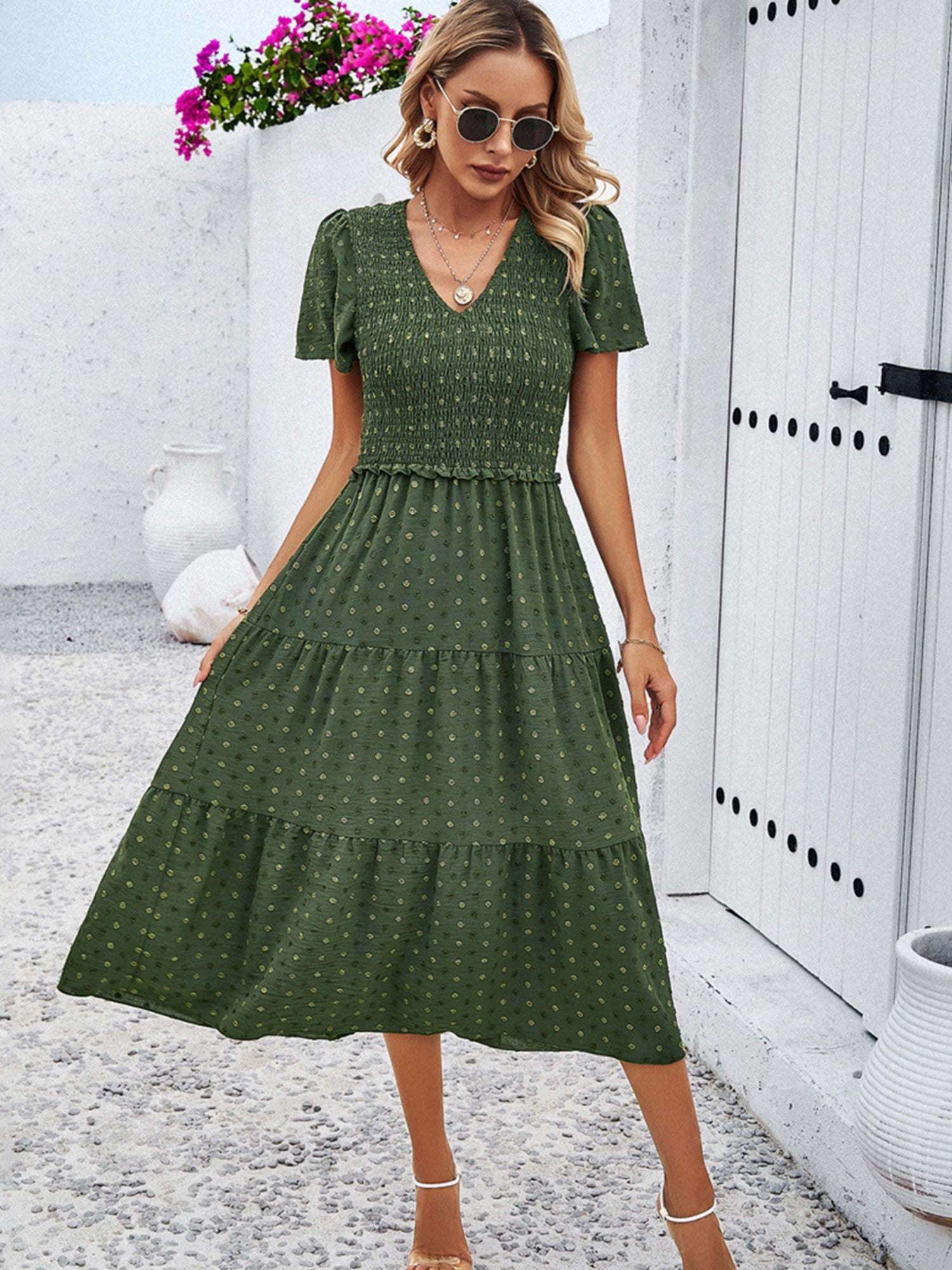 Polka Dots V-neck Tucking And Waist-cinching Short Sleeves Maxi Dresses