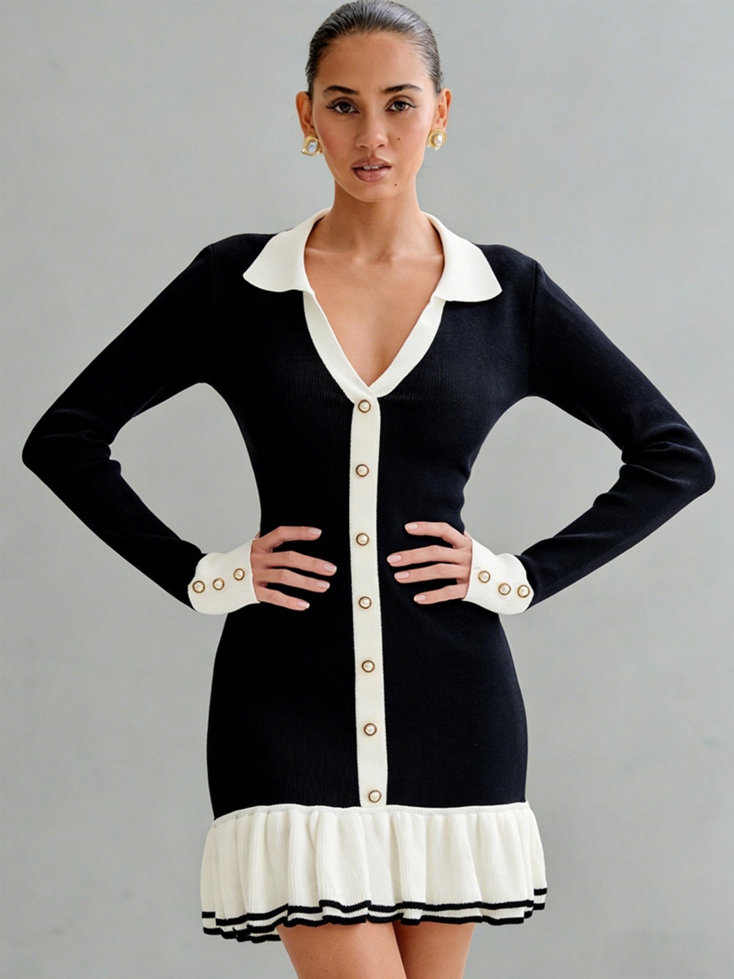 Color-blocked Ruffle Lapel Buttons Maxi Dresses